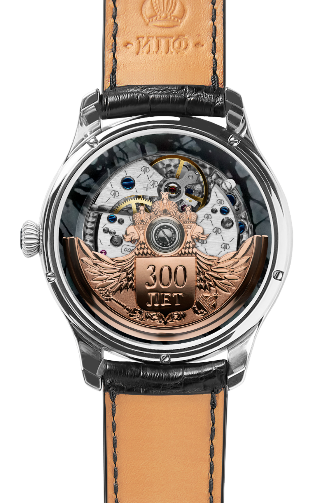 Каменное кольцо по краю циферблата этой модели из белого золота 750-й пробы выполнено из яшмы. В элегантную заводную головку в русском стиле вставлен такой же кабошон. Ротор из розового золота (его можно рассмотреть сквозь сапфировое стекло задней крышки) украшает гравированное вручную изображение двуглавого орла.