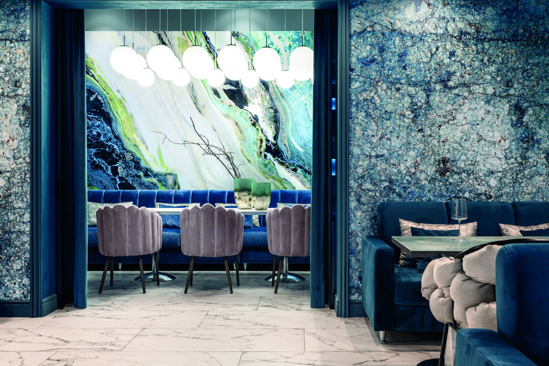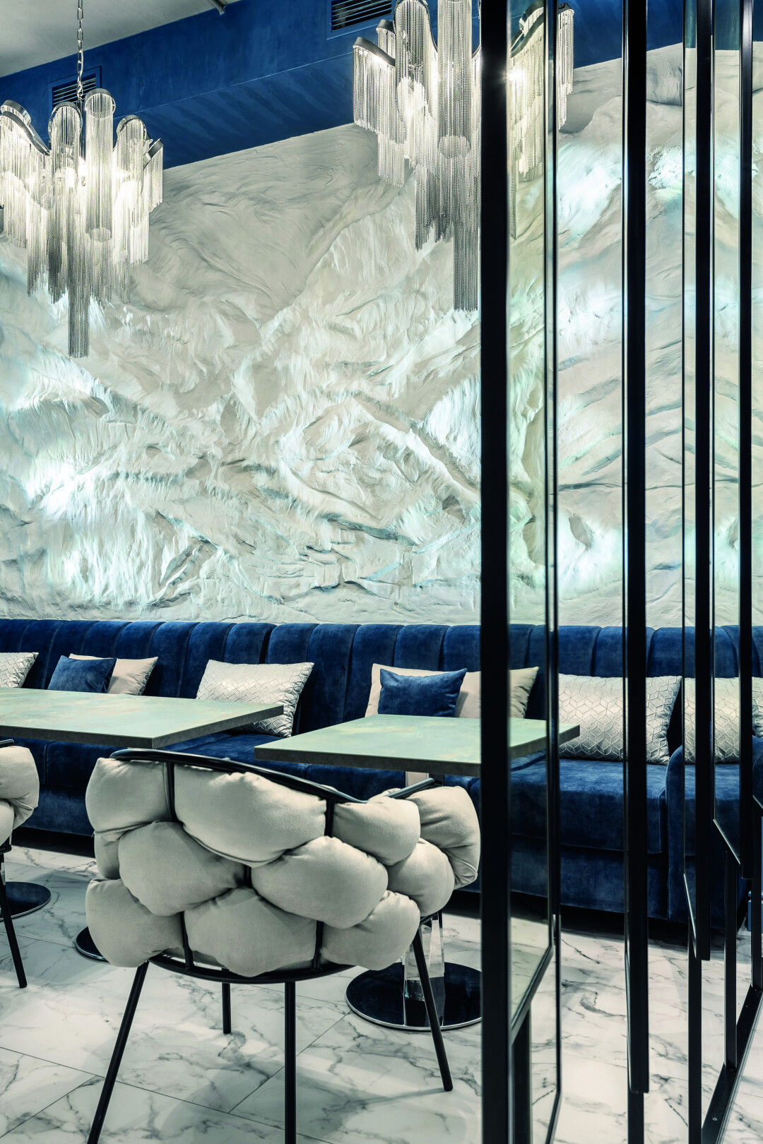Дизайнерский интерьер заведения вдохновлен Байкалом и украшен имитацией снежных айсбергов и ледяных сталактитов. Каждый уголок в заведении стилизован под отдельную фотозону.