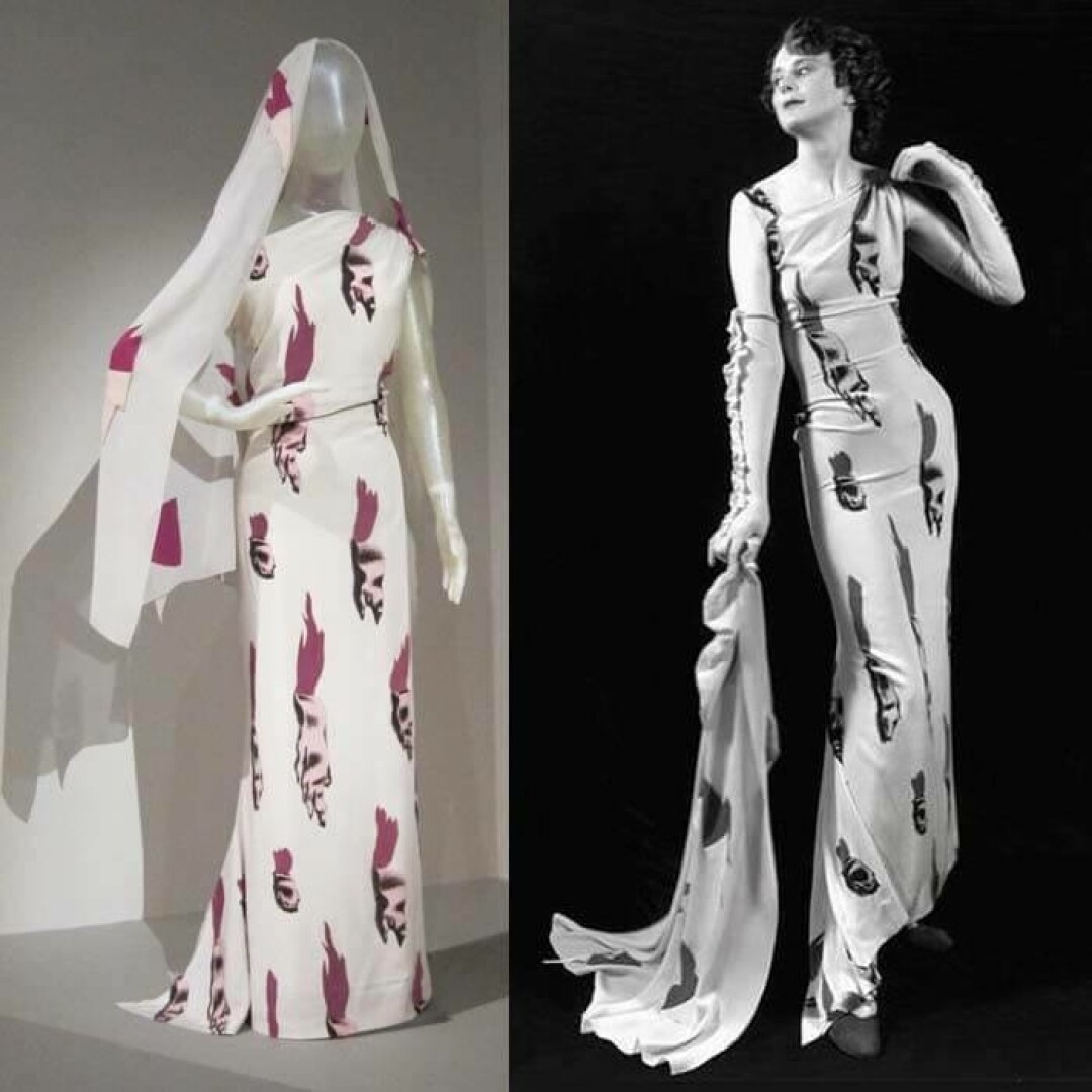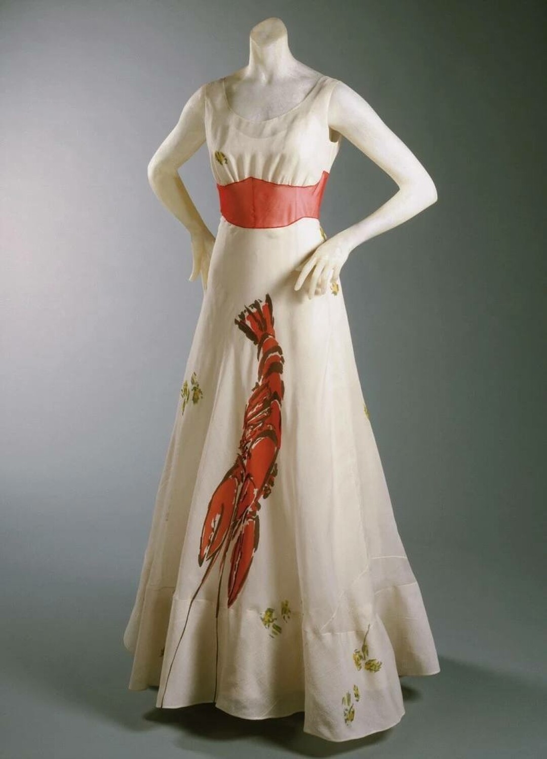 Дали в искусстве экспериментировал с формой и материей, а Скиапарелли в своих коллекциях переосмысливала взгляд на одежду. Так мир увидел белое платье из органзы с лобстером, платье-слезу, специально для которого Дали разработал особую технику печати по ткани, платье-скелет и шляпку в виде туфли.