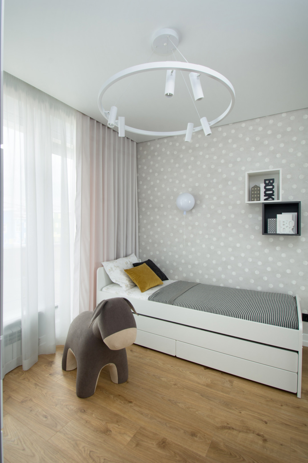 Мне очень нравится, как получилась детская комната. Удалось разделить пространство для двух мальчиков таким образом, что у каждого есть собственная спальная зона, а игровое пространство — общее. В нем предусмотрены столик, места для хранения игрушек и даже доска для рисования мелом. Обои на стенах детской заслуживают отдельного внимания. На них изображены луны, которые светятся в темноте, — это создает по ночам волшебную атмосферу.