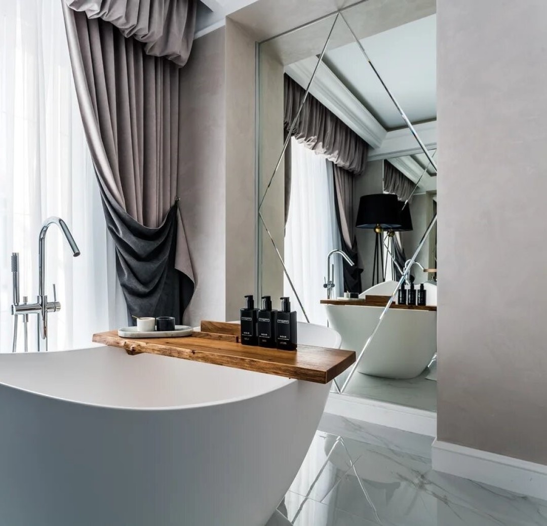 Если мы говорим о дорогих, роскошных решениях, то, скорее всего, речь идет об оформлении зеркал, их обработке. Одна из самых дорогих отделок – это зеркальное панно. И чем меньше в нем каждая деталь, тем она дороже, так как более трудозатратна в производстве. Играет роль и монтаж: панно выкладывается очень долго, за счет чего получается дорогим.