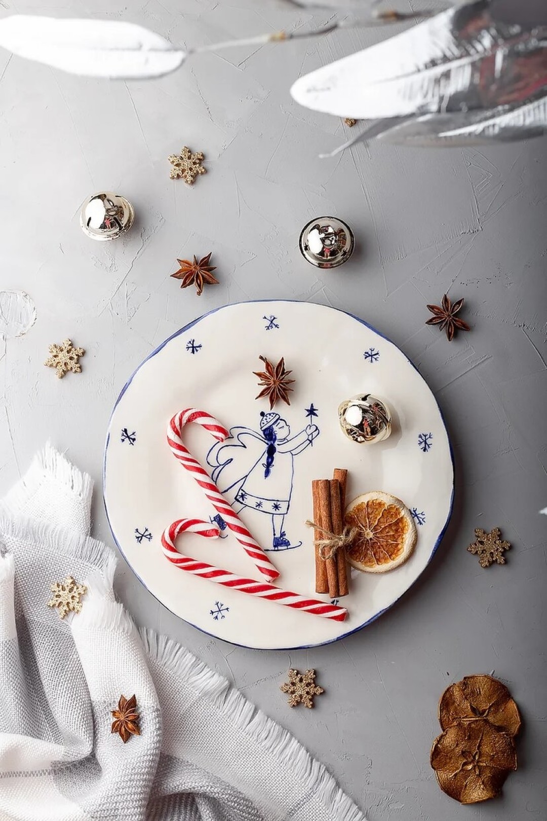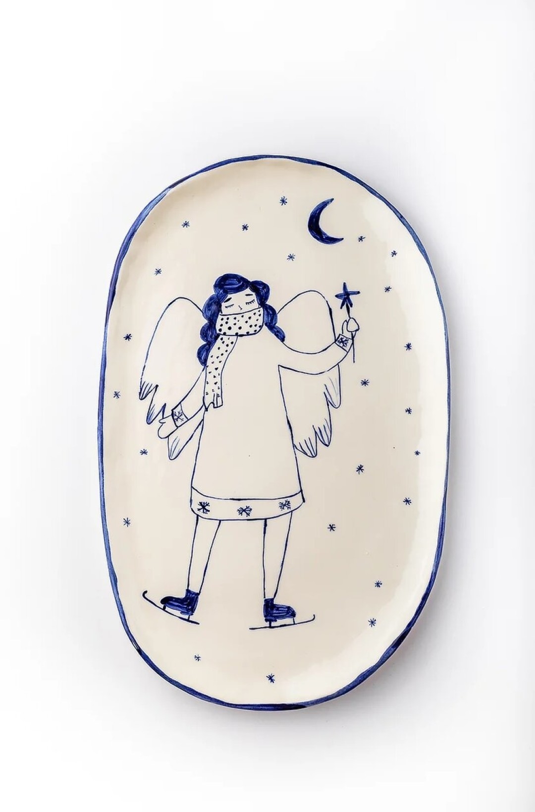 Есть посуда ручной работы с ангелочками, катающимися на коньках. Стиль изображения напоминает иллюстрации из детских книг, так что вполне может подойти ребёнку. Но и взрослым, которые любят наивный стиль, тоже хорошо подойдёт.