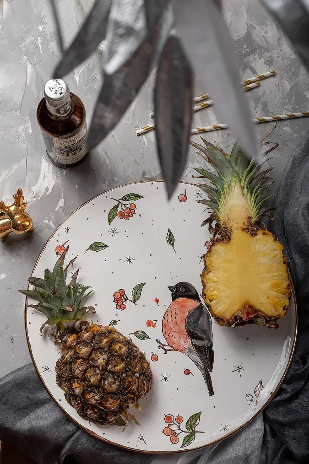 Самый удивительный из них — большое сервировочное блюдо ручной работы от российского бренда @odaryadarya.ceramic. На нем изображён снегирь, роспись ручная с использованием настоящего золота.