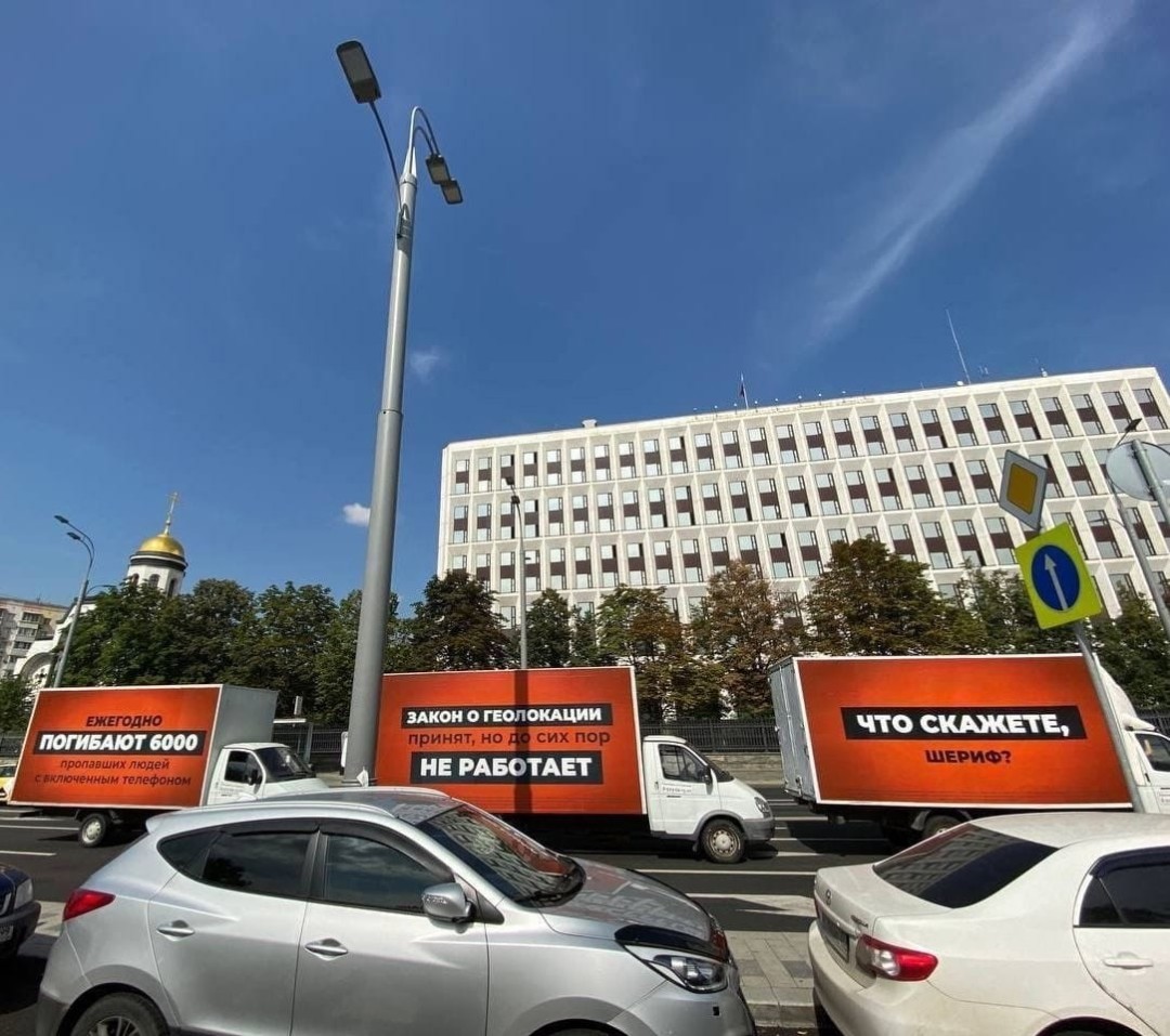 Олег Леонов, Куратор поисково-спасательной группы "Лиза Алерт", разместил необычный призыв к Владимиру Колокольцеву, министру МВД. Он запустил около главного офиса силовиков три грузовика, на которых разместил три билборда.