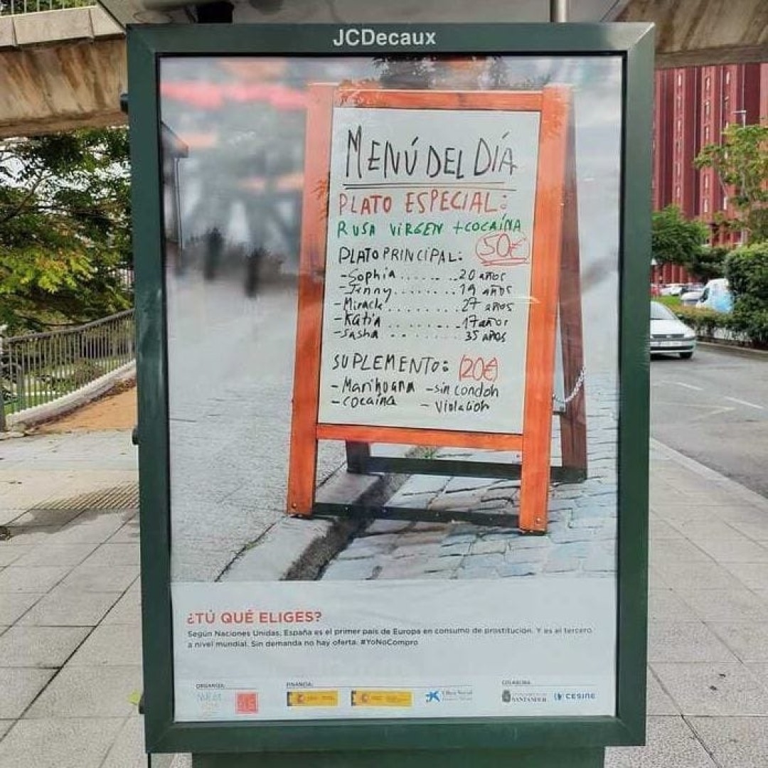 Баннер с меню разработали студенты Университетского центра CESINE в Сантандере, сообщается на сайте Nueva Vida. Глава НКО отмечает, что основная идея плакатов — «торговли людьми нет без спроса на них», и «без мужчин, потребляющих женские тела, не было бы женщин, подвергающихся сексуальной эксплуатации».
