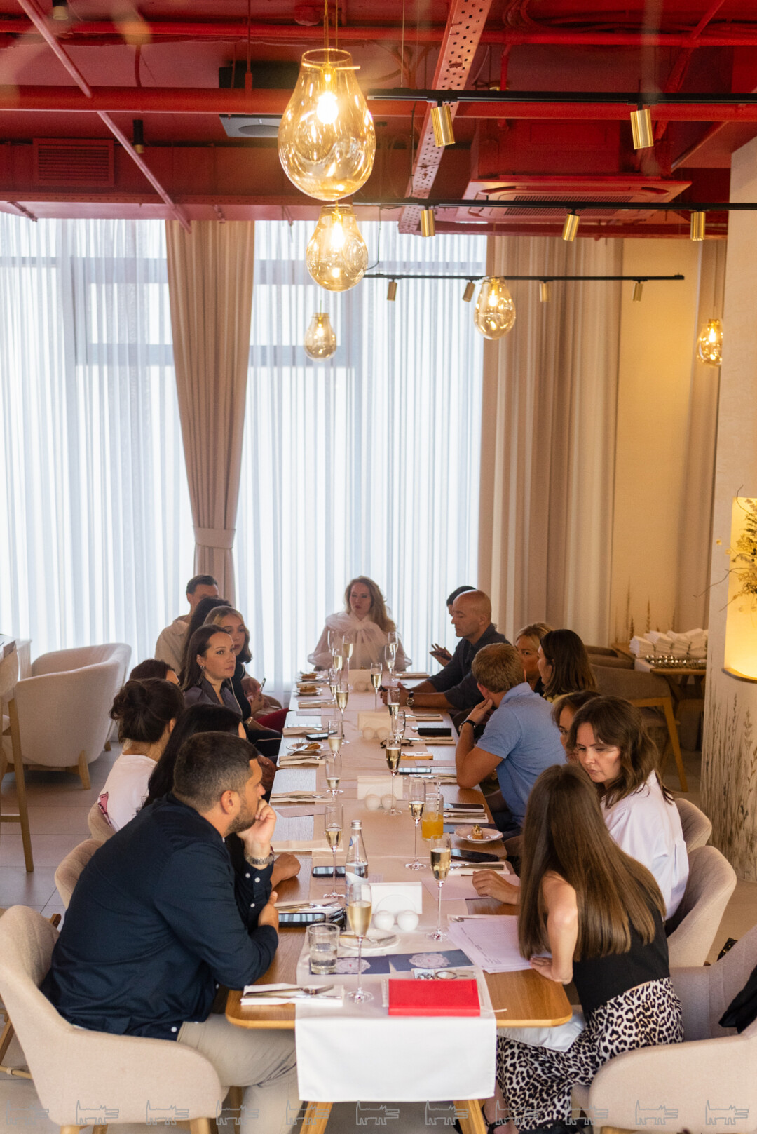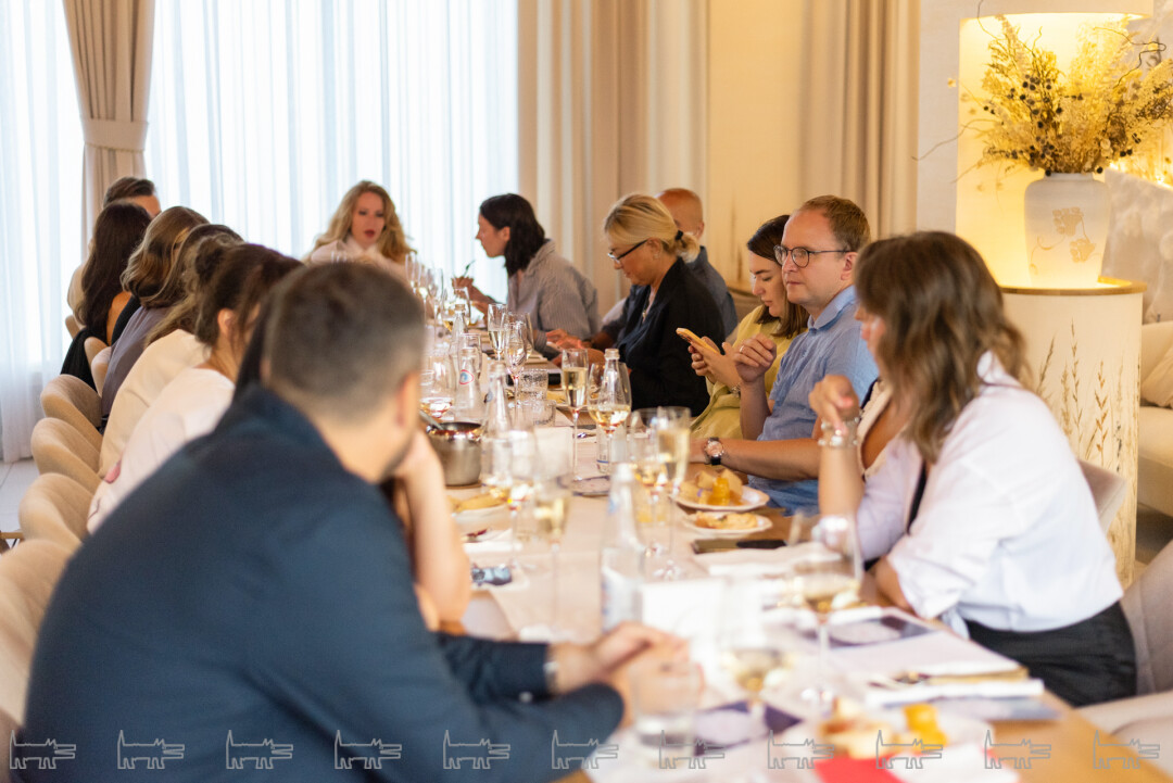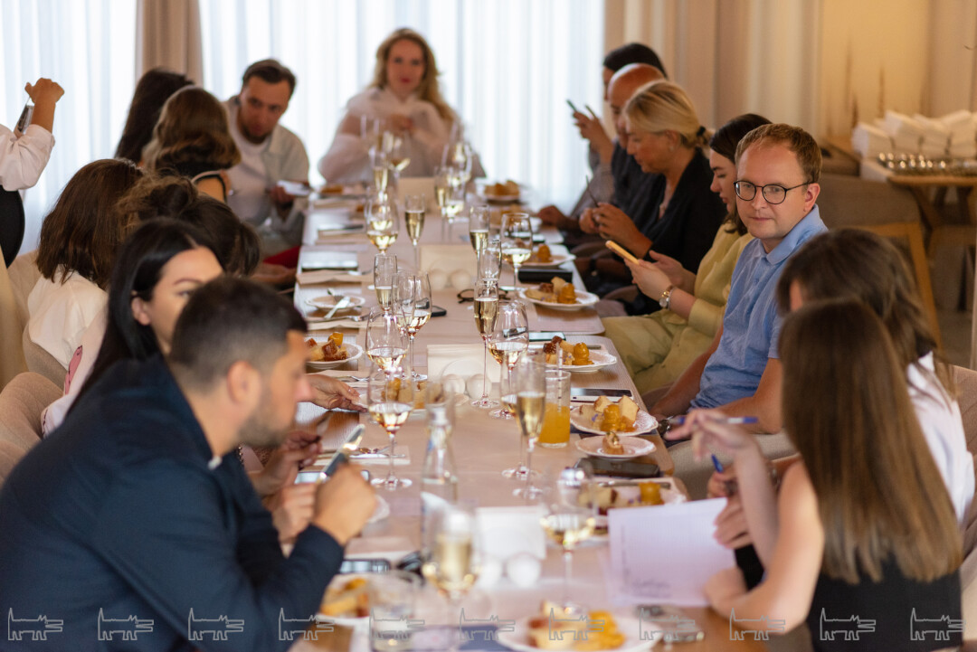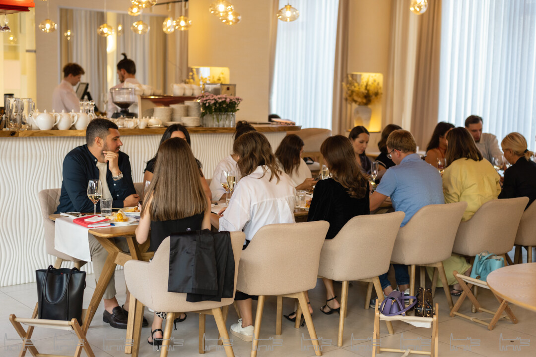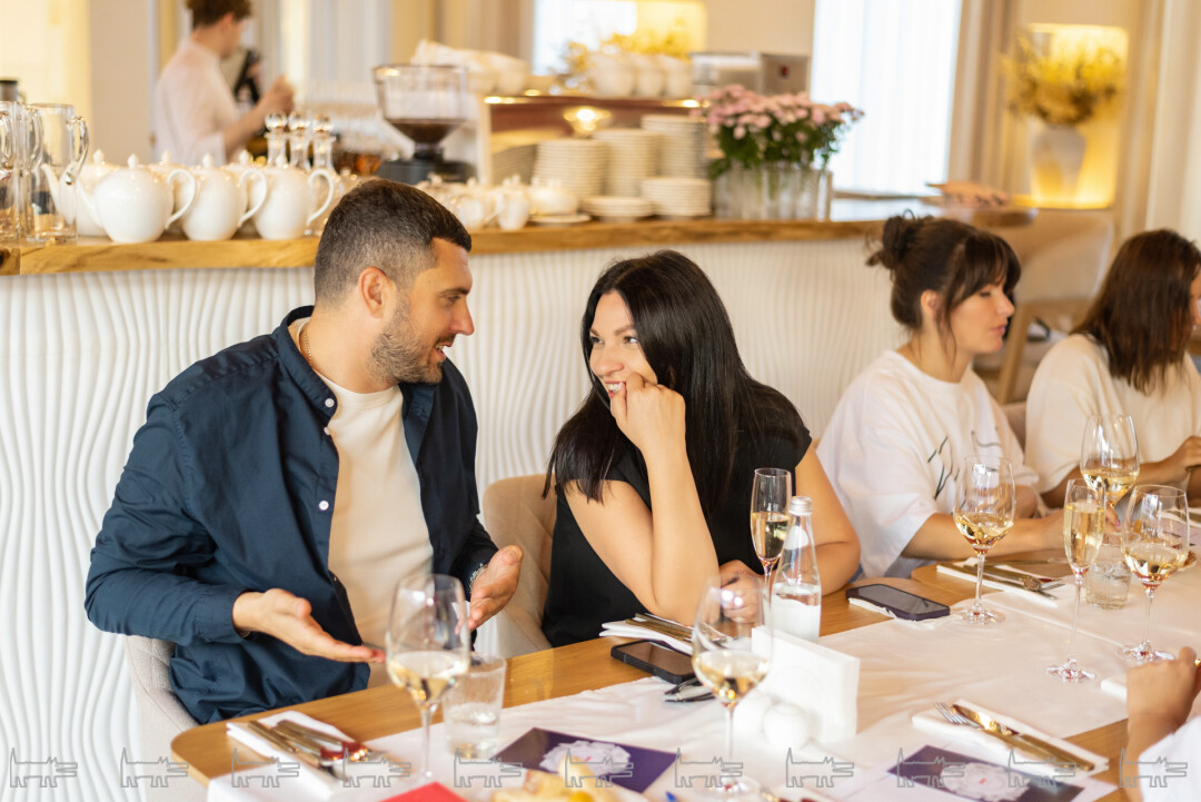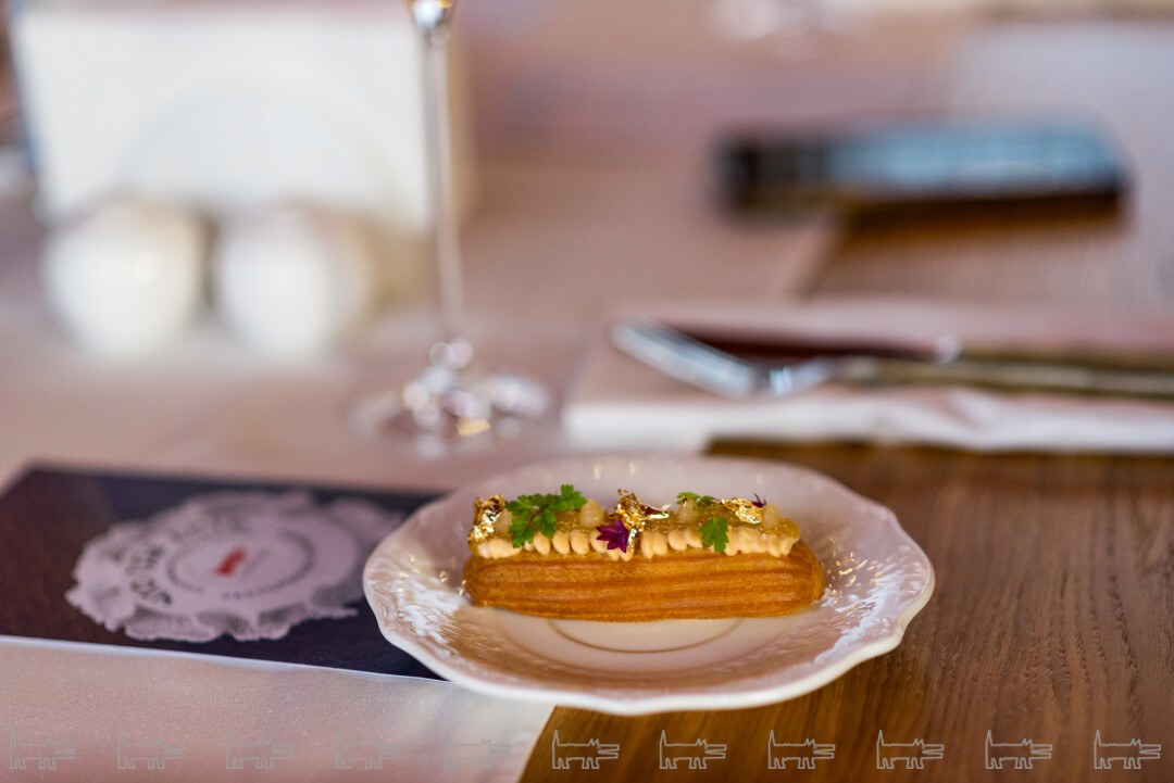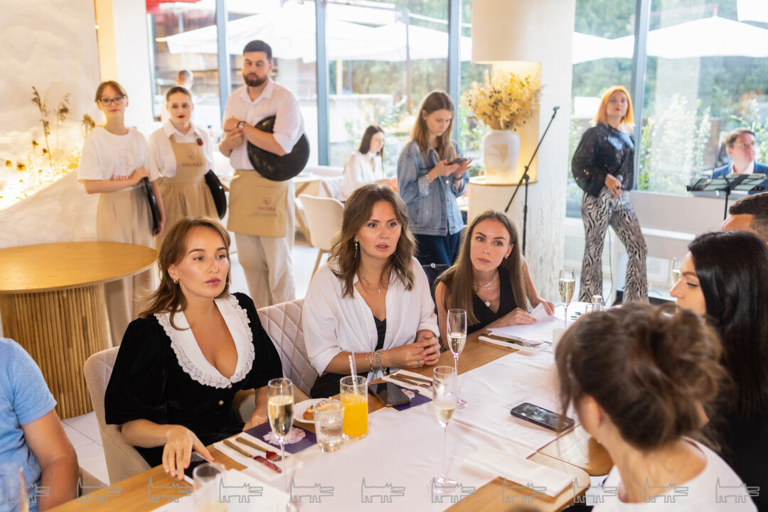 На гастроужине в «Бирукке» гостей ждал специальный сет от шеф-повара и идеальное игристое сопровождение от сомелье. На welcome был эклер с крабом и щучьей икрой, далее фирменный паштет с мочеными яблоками и домашней бриошью, тартар из заволжской форели с цитрусами, «Жульен» из краба с медовыми огурцами и моченой брусникой, перепелка с разной гречке, а на десерт — восхитительный медовик.