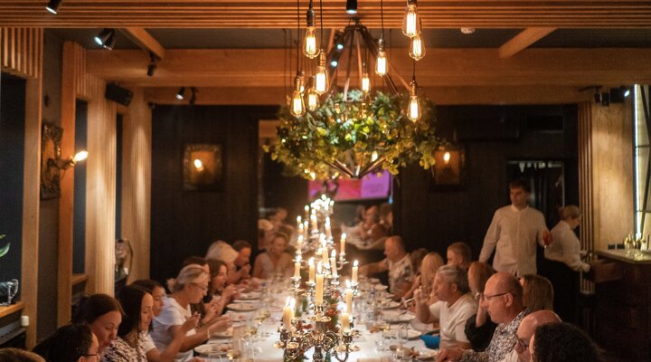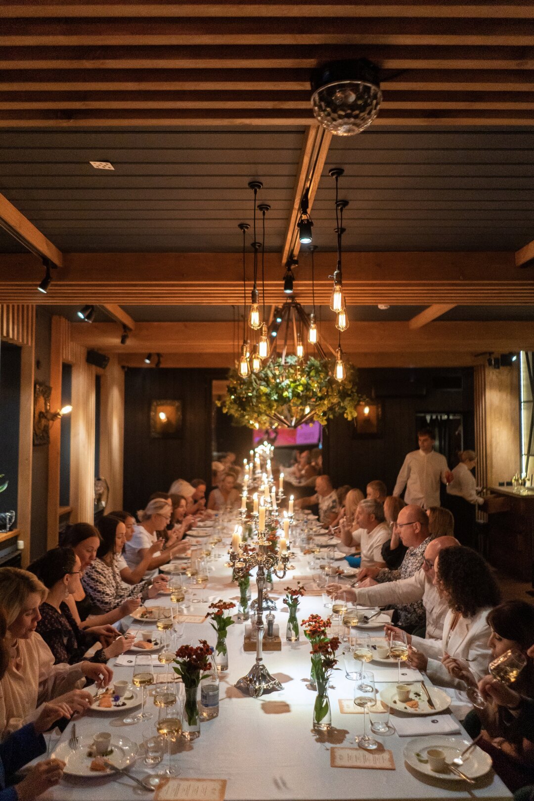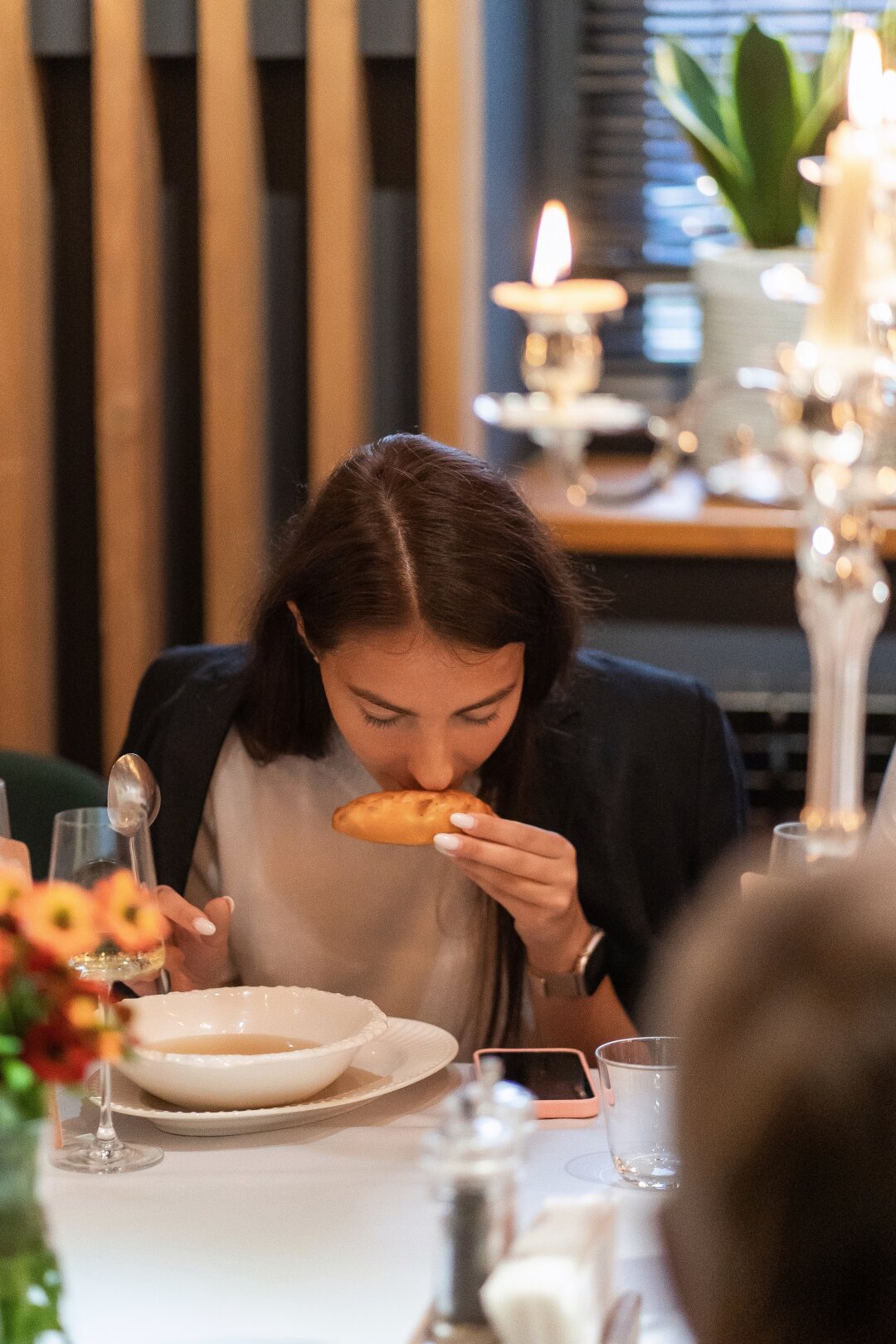 Меню оправдало ожидания гостей. Вступление составил суп «опорто» с пирожками: прозрачный бульон, тонкий аромат, аккуратная расстановка акцентов. Затем подали форель с каперсовым соусом, и ужин продолжил светлую, свежую линию вкуса. К столичному блеску отсылает котлета де-воляй из пулярки с гарниром из спаржи и цветной капусты. Блюдо собрано строго и эффектно. Фаворитом зала стала дичь конфи — бархатная текстура и выразительный, долгий вкус отметены единодушно. Десертной точкой стали дам-бланш и буше.