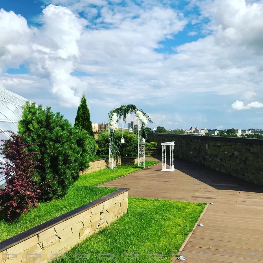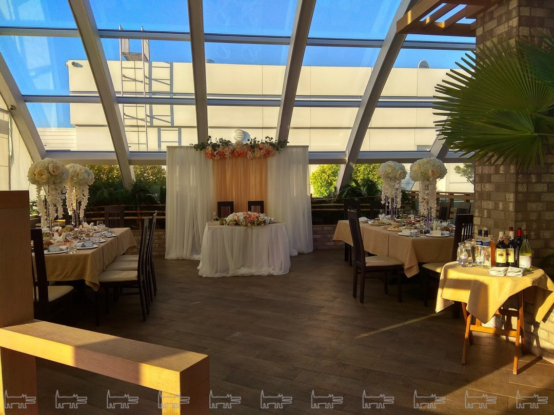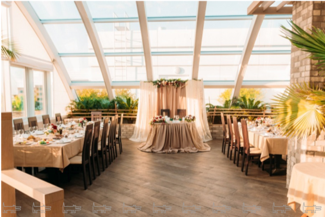 - романтичный зал «Под пальмами» с живыми растениями, деревянным декором, панорамными окнами и выходом на крышу, где вы не только сможете отпраздновать день рождения, провести свадебный банкет, но даже организовать свадебную регистрацию, а захватывающий вид на город станет прекрасным вариантом для памятной фотосессии;