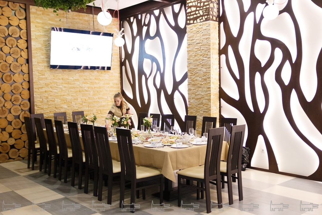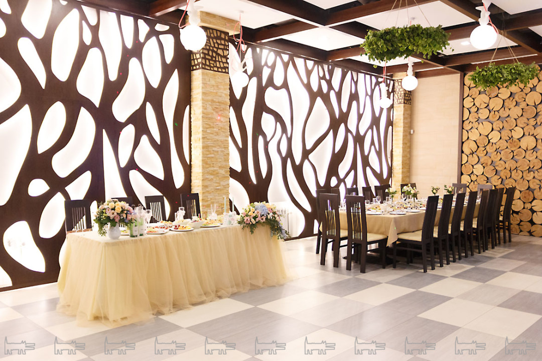 - просторный зал «Сказочный лес» на случай, если у вас намечается много гостей и хочется шумного веселья и танцев до упаду. Интерьер в стиле хай-тек гармонично сочетает в себе футуристический декор и оригинальные элементы из натурального дерева.