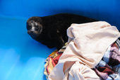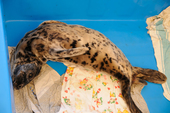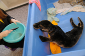 Двух маленьких тюленей сначала кормили через зонд смесью из раствора регидрона и рыбного фарша каждые 4 часа, но сейчас животные едят самостоятельно селедку и салаку. Дефицит массы тела у них составляет почти 60%, в этом возрасте они должны весит около 40 кг, но пока - 11. У девочки была повреждена передня лапа, но операция не потребовалась, сейчас она начинает ею двигать и даже кокетливо махать гостям.