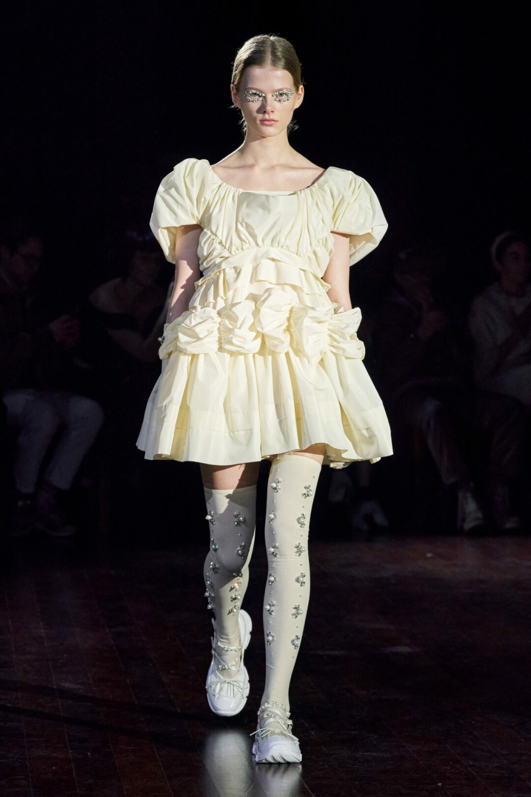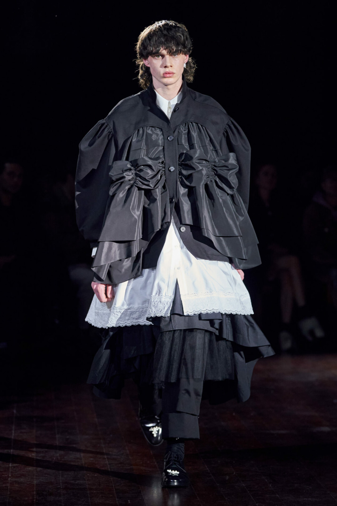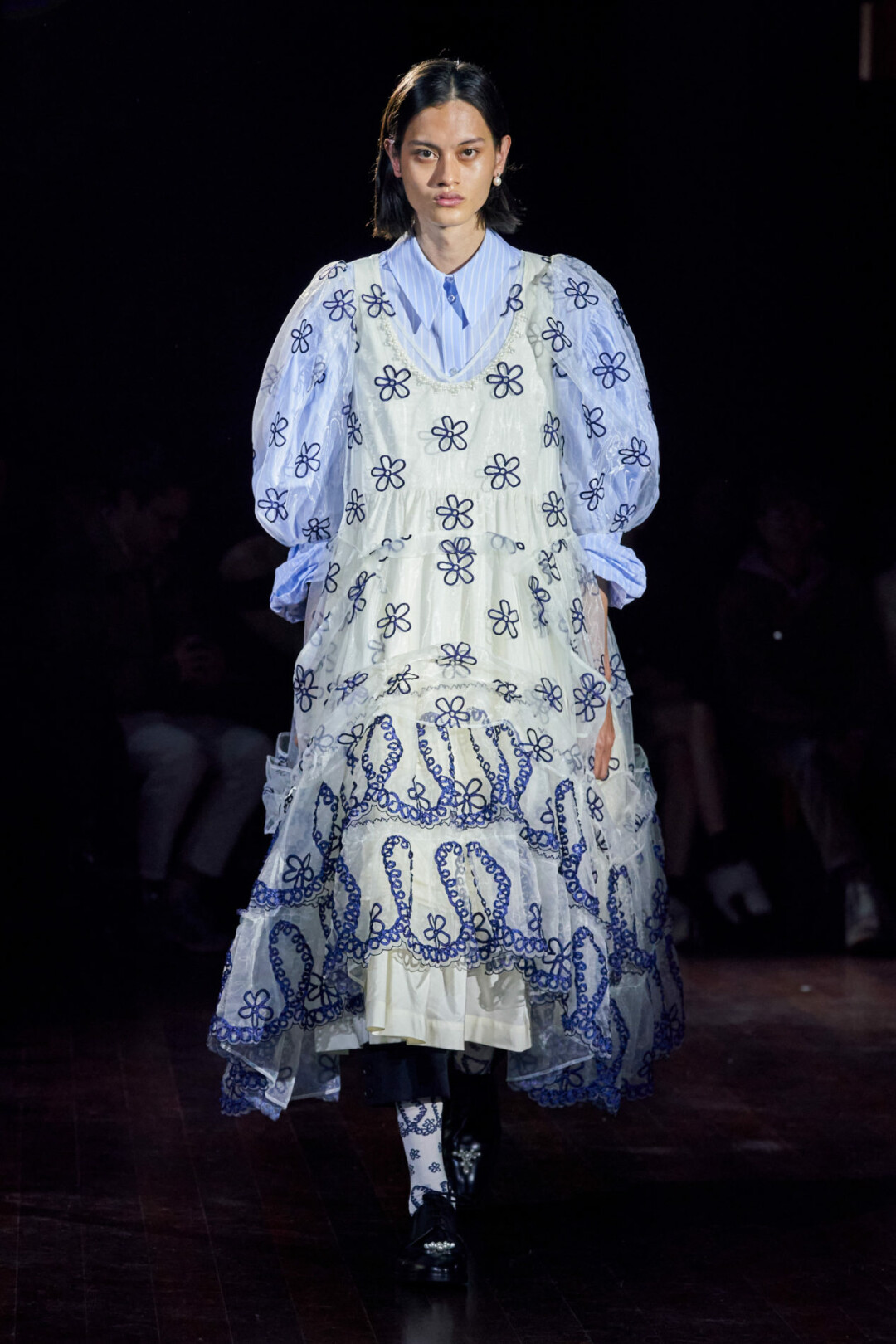 Бренд Simone Rocha показал новую осенне-зимнюю коллекцию на Неделе моды в Лондоне. Она получилась особенной, так как дизайнер Симон Роша впервые представила мужские образы: многослойные, с традиционными для бренда воланами, оборками и бантами, с платьями и юбками поверх брюк. Их трудно отличить от женских, поэтому коллекцию смело можно назвать агендерной.