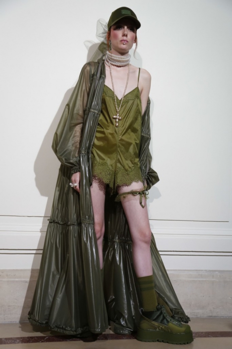 На свитшотах пастельных оттенках — элементы рококо-корсетов, а на кружевных топах, наоборот, — завязки, как на худи. Розовые парки имитируют крой платьев королевы, а лучший стайлинг для них – это жемчуг на шее и руках.
