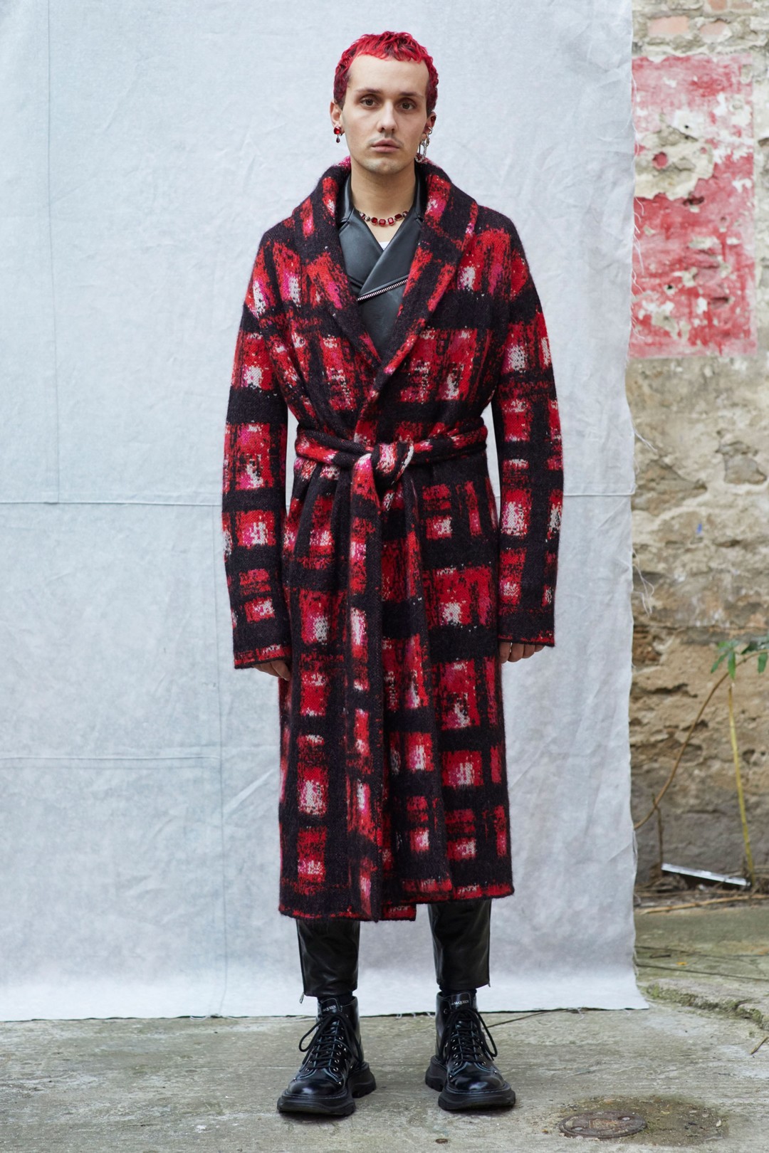 В осенне-зимней мужской коллекции дизайнер использовала те же приемы и мудборд, что и в женской. Сара Бертон отвезла команду на фабрики Северной Англии — William Halstead, John Foster, Bower Roebuck, Savile Clifford и Joshua Ellis — и забрала оттуда не только ткани и фурнитуру, но и звуки, механизмы и подручные инструменты мастеров. Отсюда — кутюрные «обвесы» пиджаков, которые больше напоминают намагниченные крепежные изделия, и крупные прозрачные очки, очень похожие на профессиональную экипировку. «Сердце коллекции вдохновлено тканями, которые мы видели, а также взаимодействием человека с машиной», — рассказывала Бертон.