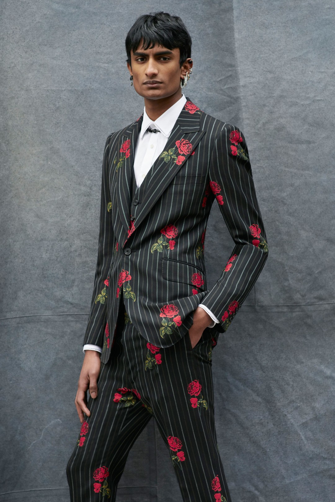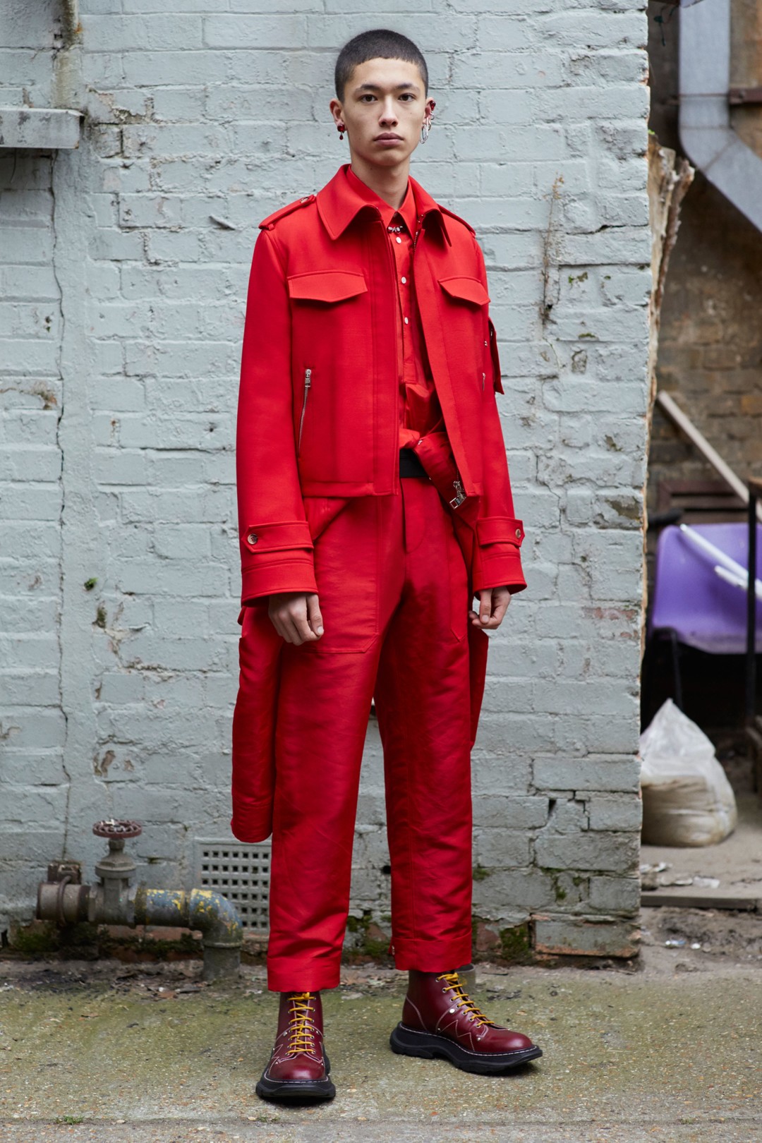 Креативный директор Alexander McQueen Сара Бертон показывает, как будут выглядеть мужчины в 2020 году: джемперы с цветочными вышивками, заправленные в классические брюки, розовые костюмы, стилизованные ожерельями и сережками, обтягивающие пиджаки, дополненные имитацией кружева, и кожаные юбки с торчащими из-под подола брюками.