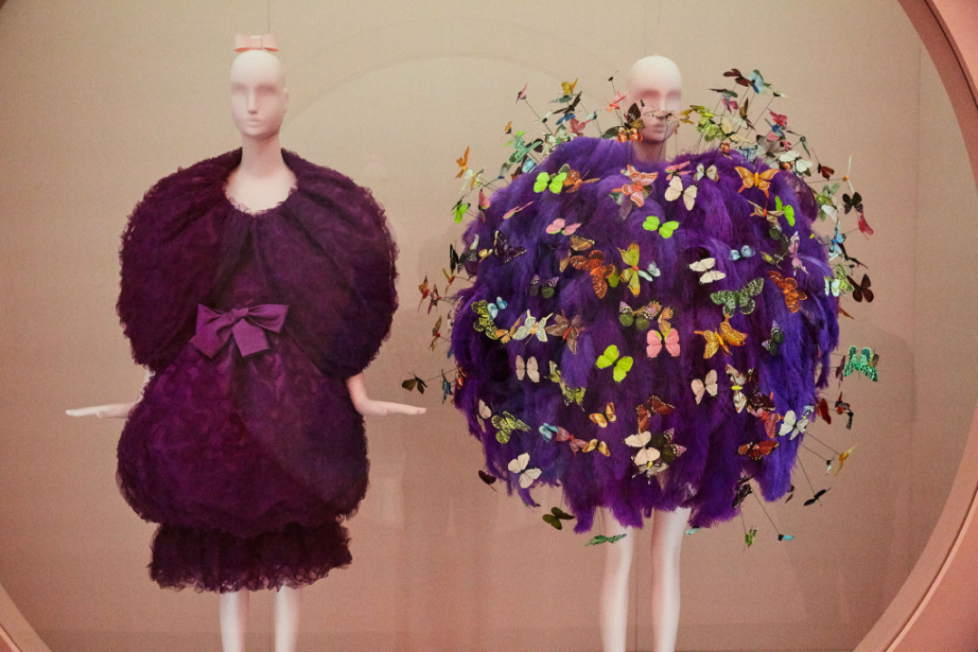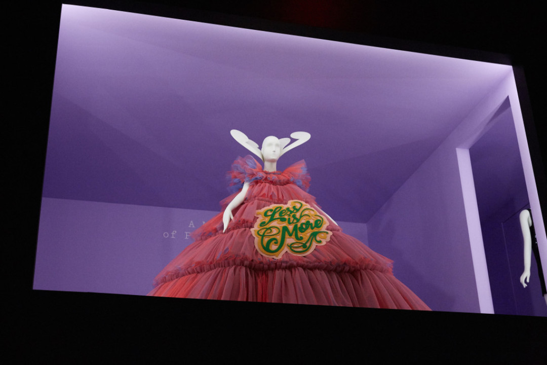 Какие образы на тему гротеска и абсурда, выберут гости Бала Института Костюма, мы узнаем чуть позже, а вот экспонаты с выставки «Кэмп: заметки о моде» можно увидеть уже сейчас. Это образы из коллекций Balenciaga 1961 года, Moschino 1990-го года и Gucci 2016 года (именно этот бренд стал спонсором выставки), а также с недавнего кутюрного шоу Viktor & Rolf — с вышитыми фразами «Меньше — больше», «Катись в ад» и «Прости я опоздала — не хотела приходить».