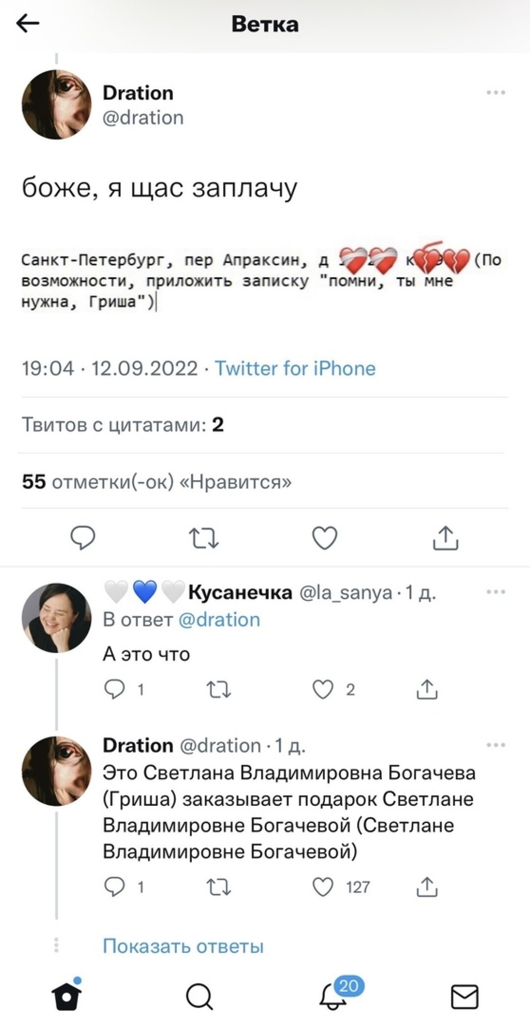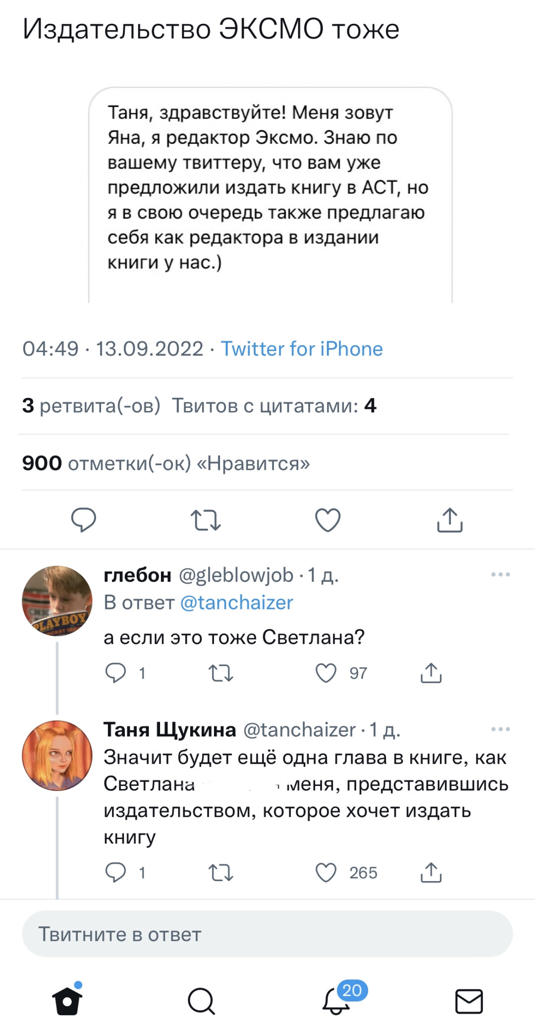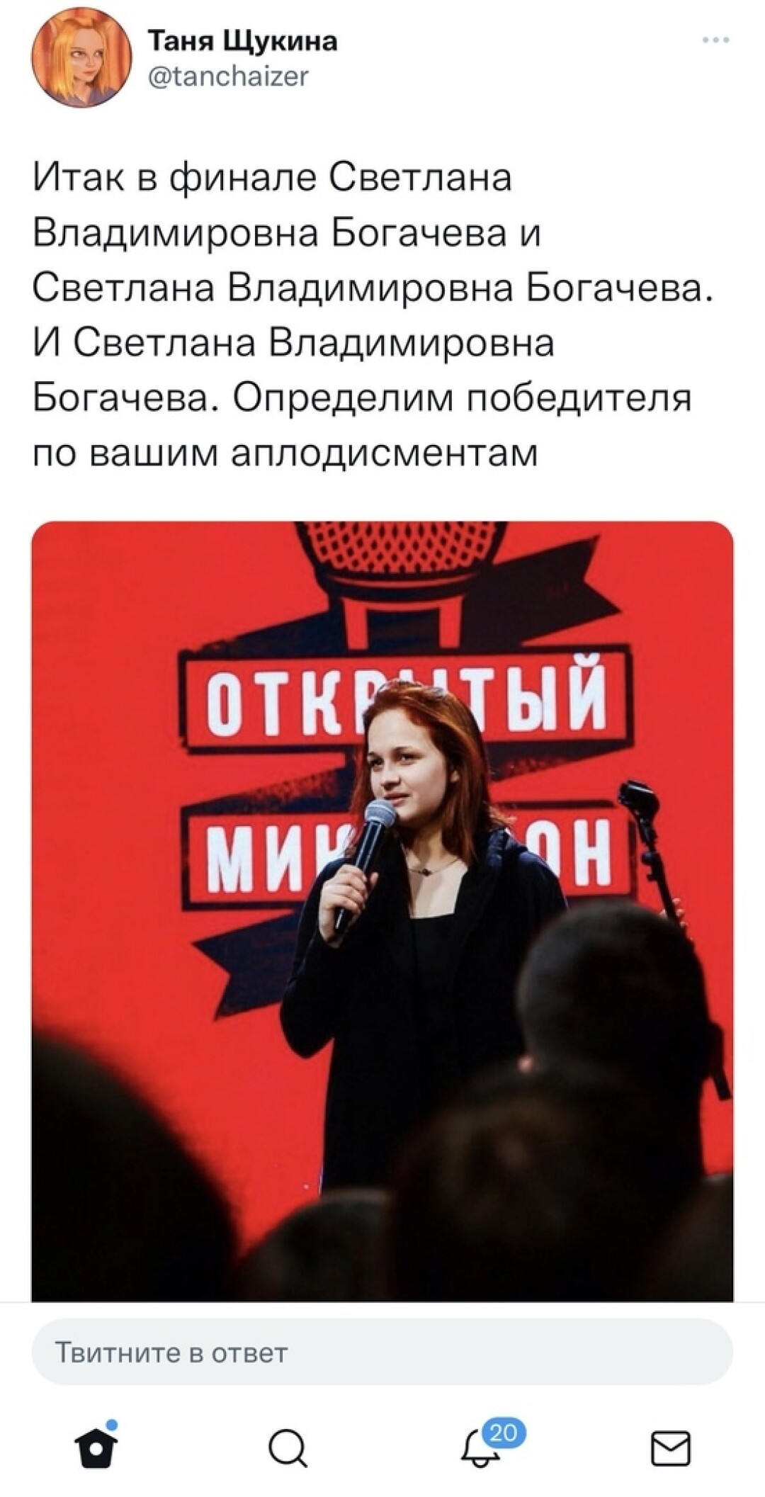 «Три года я жила со Светланой Владимировной Богачевой. Спасала ее от рака, переписывалась с ее врачами, психологами. ФСБшник, с которым я знакома, оказывается, не общался со мной. Это была Света. В РФ меня не искали! Простите, это тред. Я три года жила с аферистом-шизофреником», — так начинается рассказ петербурженки и стендап-комика Тани Щукиной, ставший вирусным в Twitter.