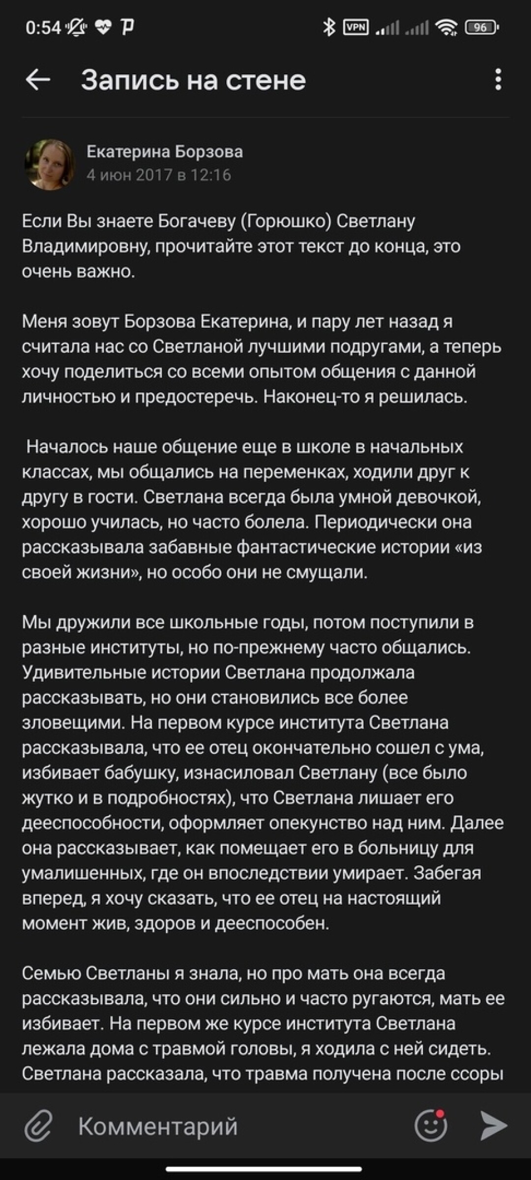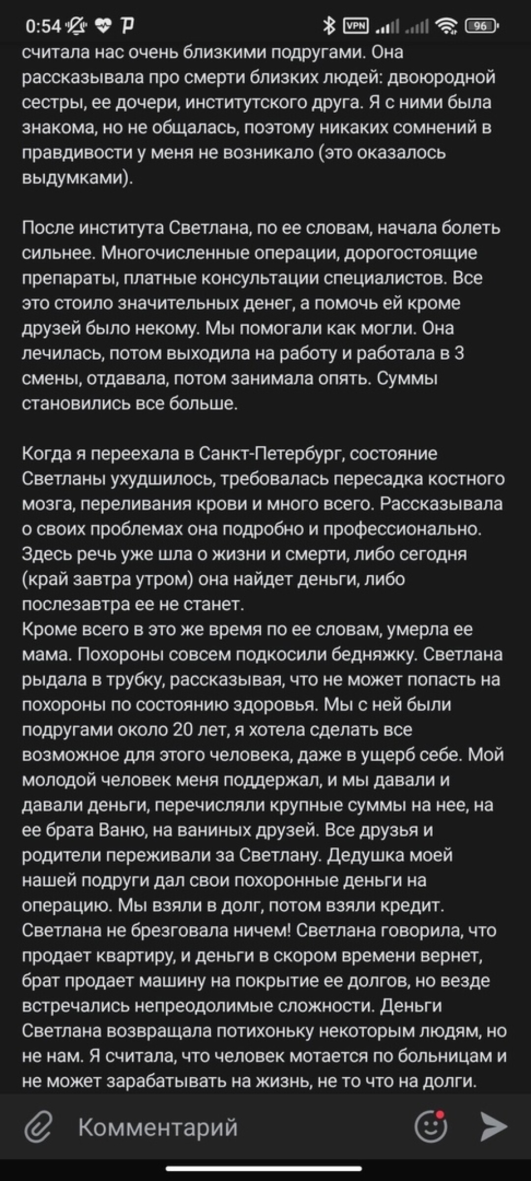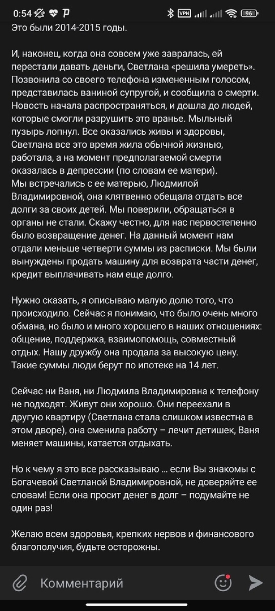 Уже тогда, в 2017 году, в комментариях под постом Екатерины Борзовой во ВКонтакте собрались и другие люди, знакомые со Светланой Богачевой. «Мда. Светлана в своем репертуаре. Пару раз просила в долг 30 000, рассказывая при этом небылицы. Естественно, не поверила, денег не дала. Маму хоронила, сама умирала, перенесла множество операций. Этого, конечно, тоже не было. Однажды имела наглость прийти ко мне на работу и попросить 12 000 на операцию, которую ей якобы назначили на следующий день. Естественно, никакой операции не было. Да и денег она не получила», — писала девушка по имени Дарья.