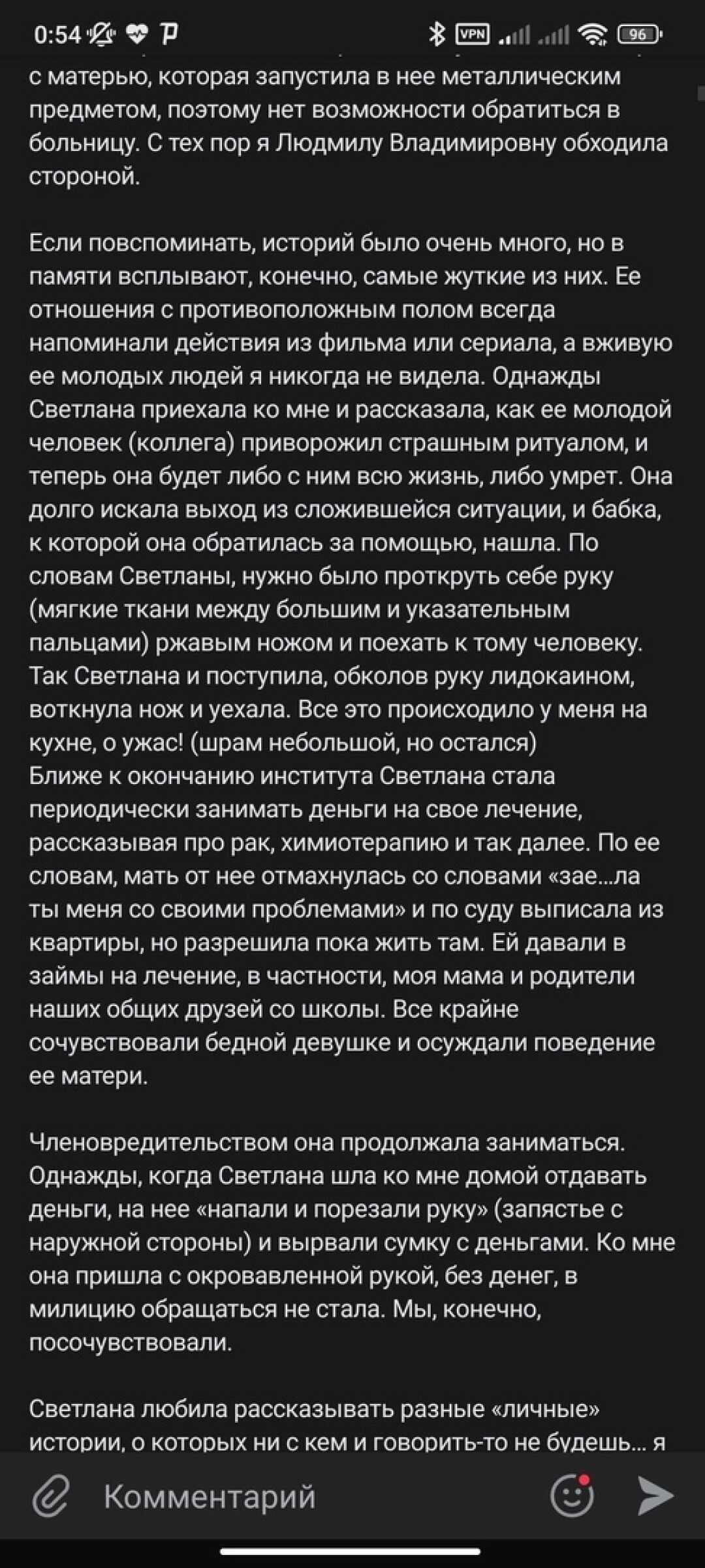Если повспоминать, историй было очень много, но в памяти всплывают, конечно, самые жуткие из них. Ее отношения с противоположным полом всегда напоминали действия из фильма или сериала, а вживую ее молодых людей я никогда не видела. Однажды Светлана приехала ко мне и рассказала, как ее молодой человек, коллега, приворожил страшным ритуалом, и теперь она будет либо с ним всю жизнь, либо умрет. Она долго искала выход из сложившейся ситуации, и бабка, к которой она обратилась за помощью, нашла. По словам Светланы, нужно было проткнуть себе руку, мягкие ткани между большим и указательным пальцами, ржавым ножом и поехать к тому человеку. Так Светлана и поступила, обколов руку лидокаином, воткнула нож и уехала. Все это происходило у меня на кухне, о ужас! Шрам небольшой, но остался.