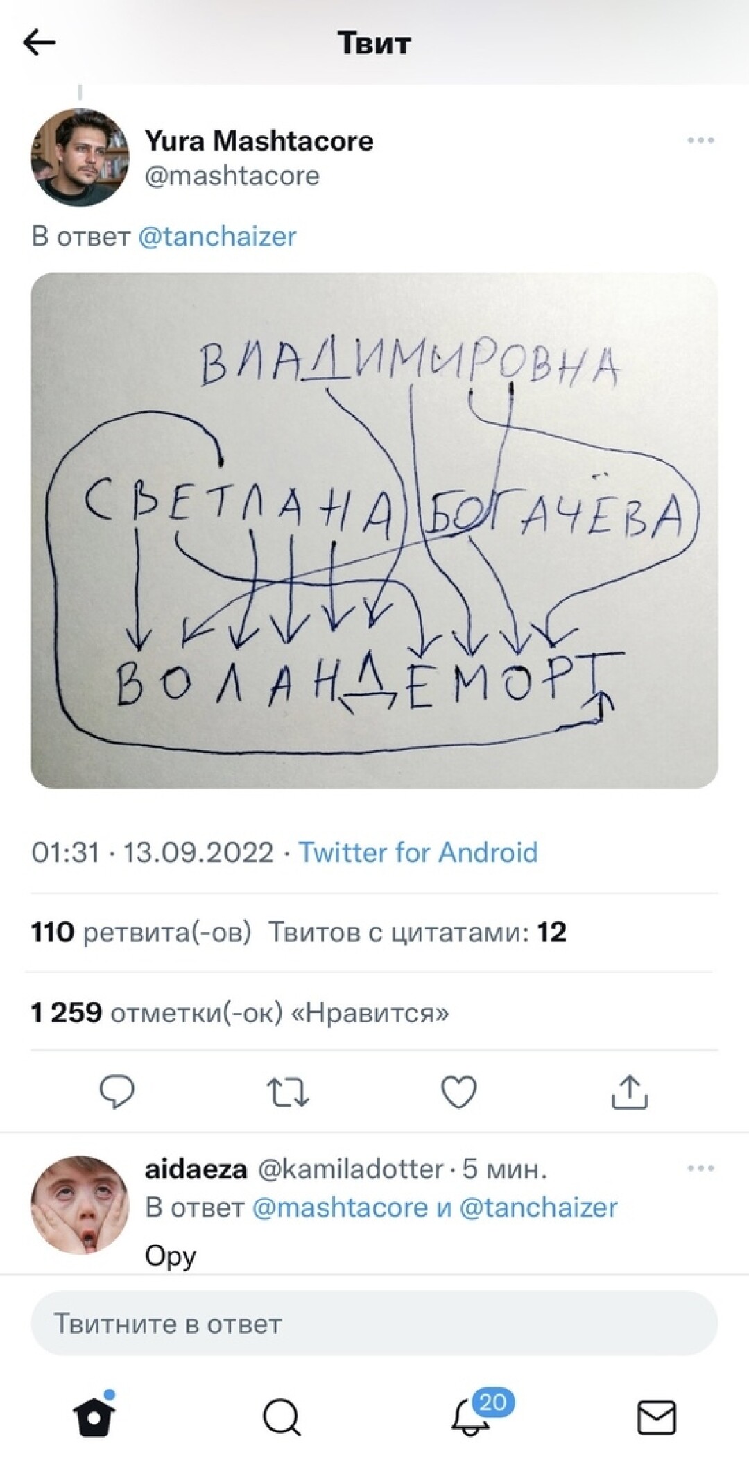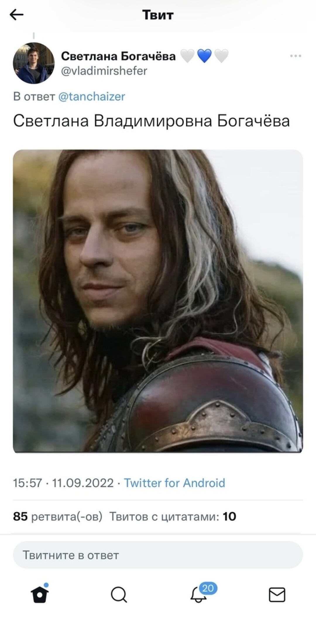 В Twitter активно отреагировали на историю Светланы Владимировны Богачевой. Пользователь «Hyperhyprochondriac» написал путеводитель по «удивительному миру Светланы Богачевой», назвав его «Доктор Светлана: в Мультивселенной Безумия». «Хотел полноценного руководства по лору мира, с иллюстрацией, книжным оформлением и всем этим во, но в одиночку делать не могу. Желающие помочь приветствуются», — поделился он. Девушка под ником «kanzerkanz» сделала «тест на персонажей из вселенной Светланы Богачевой».