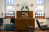 Дизайн помещения от и до разрабатывали сами владельцы. Мебель искали в антиквартных лавках, комиссонных магазинах и на блошиных рынках, что-то специально заказывали из Финляндии. Получилось, что стена в зале хоть и сохранила единый винтажный стиль, но обставлена вещами из разных эпох: Например, старый комод "от бабушки" при покупке нового не выбрасывается, а мирно соседствовует с ним в одном помещении. А сталинский кожанный диван вполне уживается с кофеваркой.