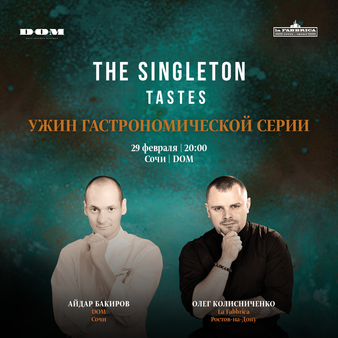 Проект The Singleton Tastes стал объединяющей платформой для разных с гастрономической точки зрения регионов и городов, сделав своей целью развитие общей гастрономической культуры и знакомство публики с концепцией фудпейринга. Мастерство шефов, каждый из которых обладает своим стилем, их энергия и страсть, выраженная в еде, стала уникальным опытом для всех любителей гастрономии. В начале ужина в D.O.M. можно будет попробовать коктейли на основе односолодового виски The Singleton и на примере созданных шефами гастрономических пар разобраться в тонкостях фудпейринга.