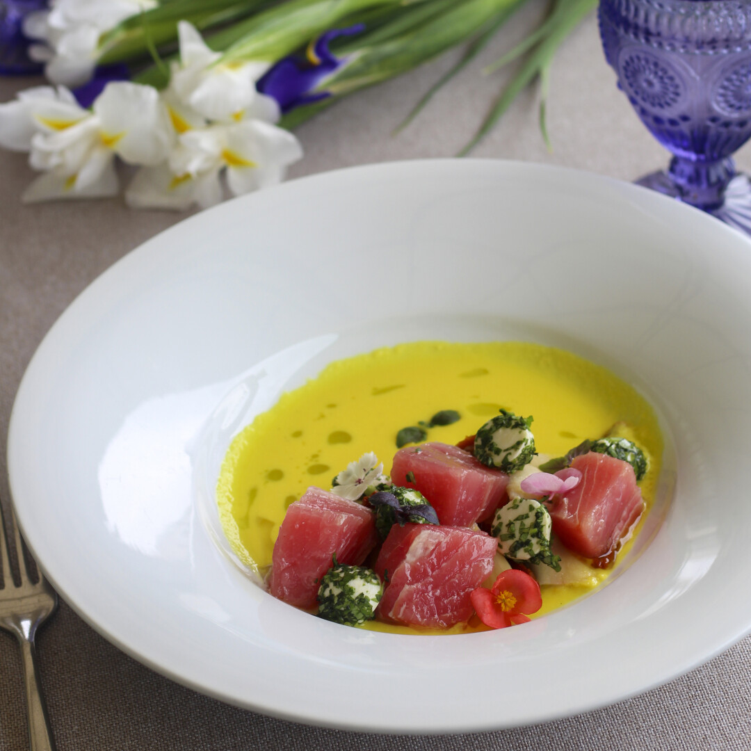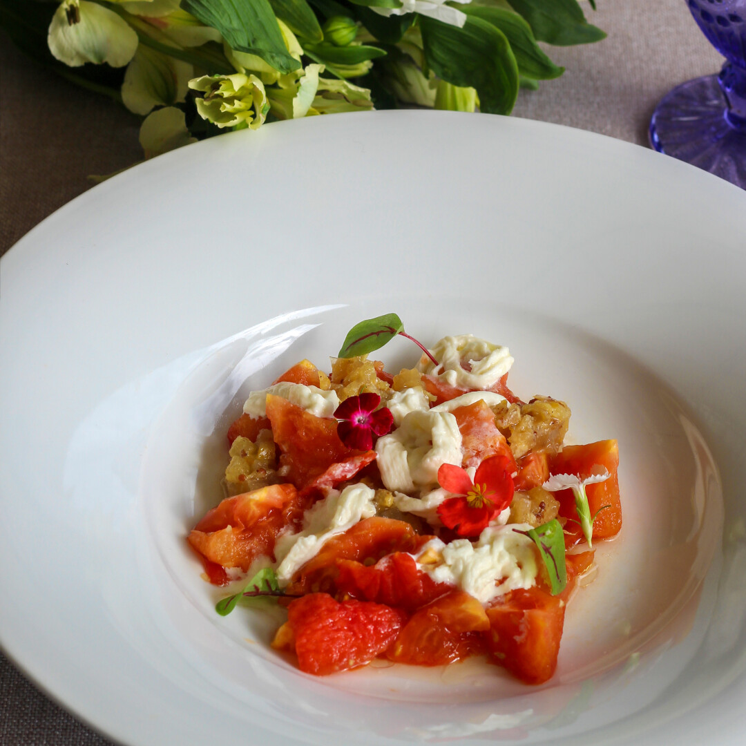 Гастрономическая оттепель наступает в ресторане «Босфор» в меню авторских блюд от шеф-повара «Имеретинского», новых, кстати, здесь семь позиций. Главный на кухне точно знает, что вкуснее свежих томатов могут быть только вяленые, поэтому первый салат состоит именно из них в компании с фруктовой мастардой, маринованным артишоком, тунцом и моцареллой в базилике. Холодная закуска претендует на место в музее гастрономических искусств и представляет собой мозаику из трески и лосося с кокосовым молоком и зеленым маслом. Еще один примечательный экспонат – фирменный крем-суп из печеных яблок, утиной грудки, страчателлы и ферментированной капусты. В категории основных блюд центральным все-таки являются предпочтения самого гостя — нежный эсколар в паре с гарниром из томатов черри и яичным соусом или фаршированная перепелка с пюре из каштанов, стейком из цукини и кокосовым соусом. Завершает галерею премьер бриошь с соленой карамелью и мороженым.