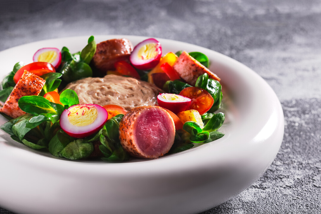 - Салат с татаки из тунца и печени трески 1180 р
