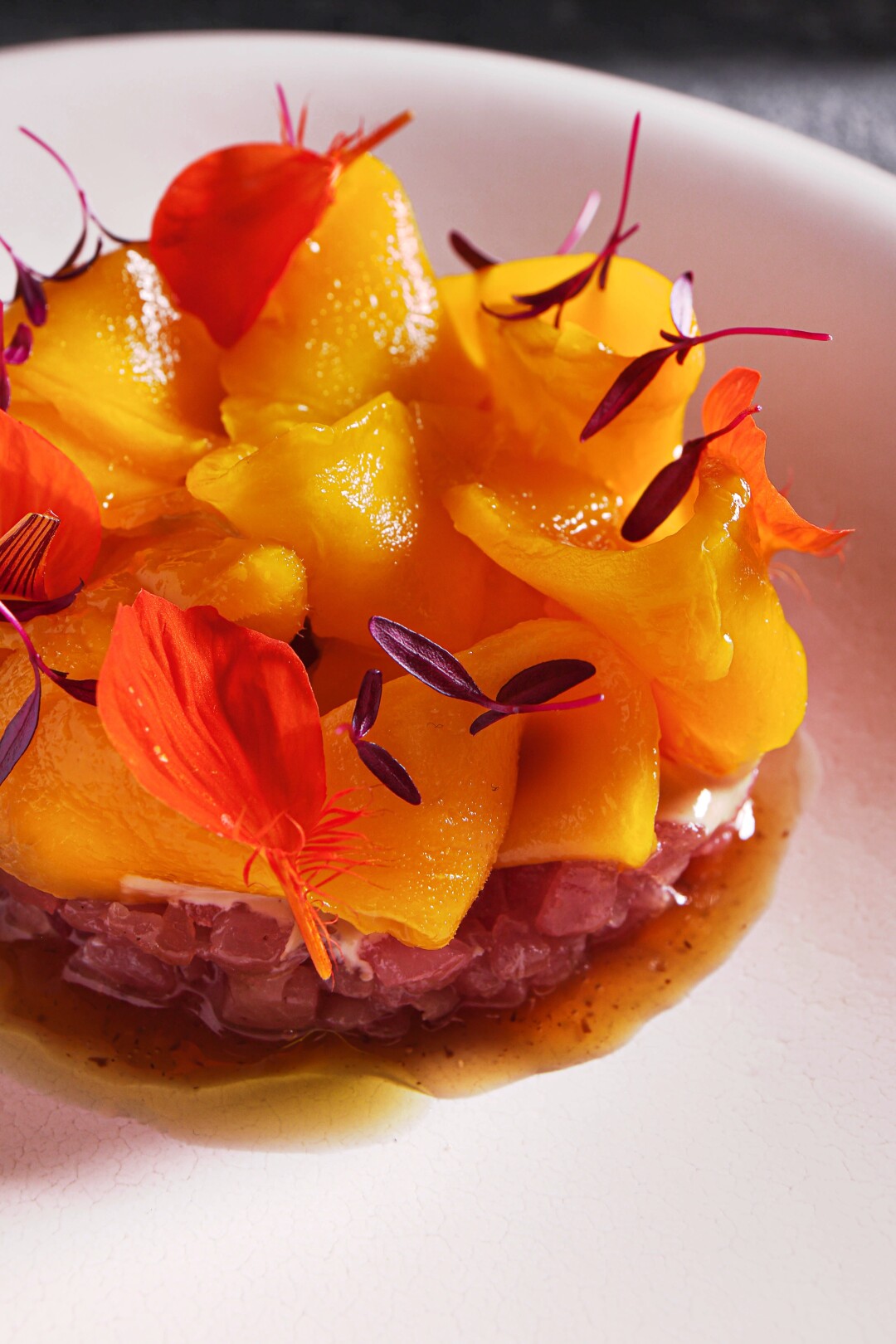 - Тартар из тунца с манго и сезонными ягодами 860 р