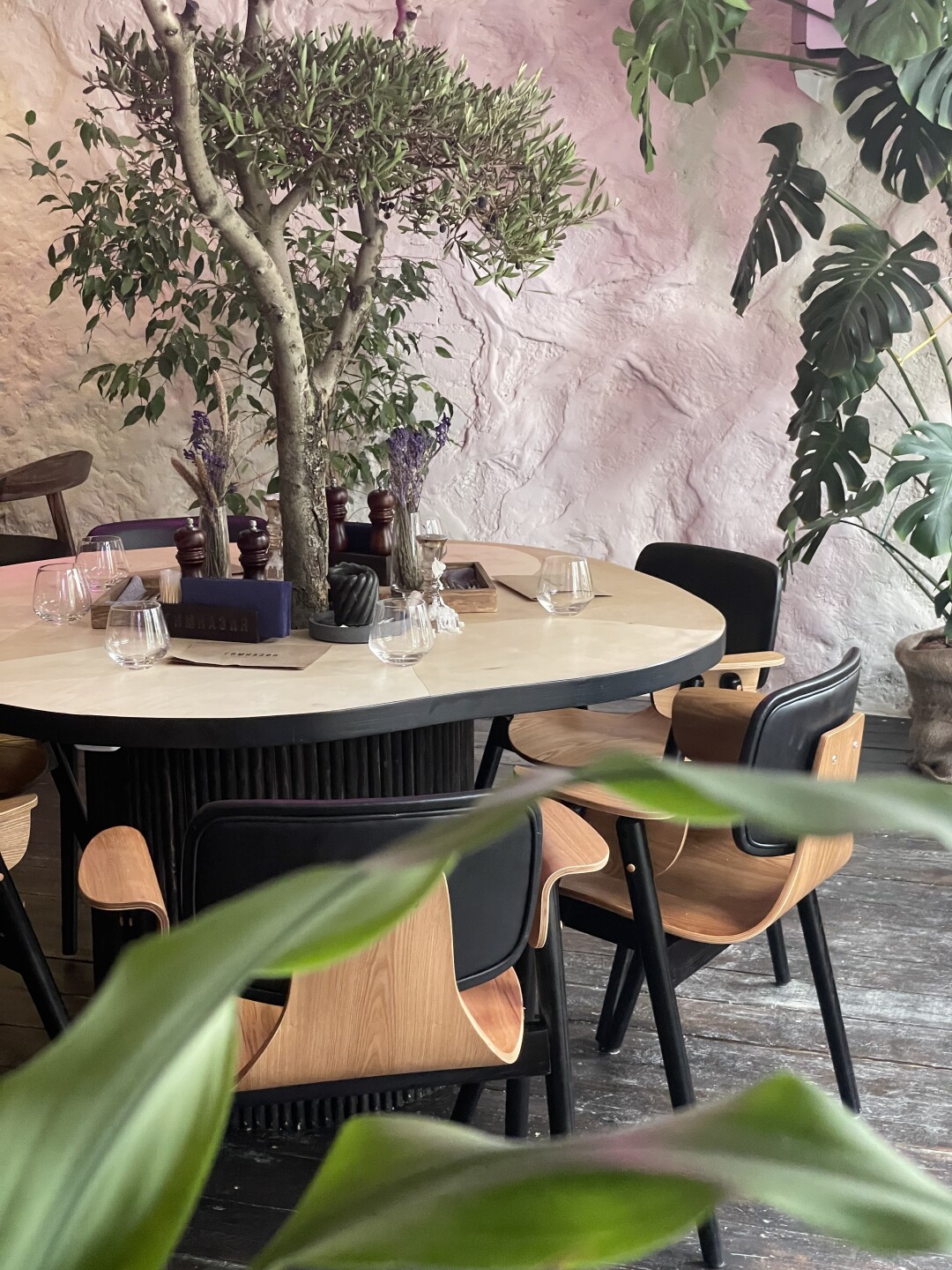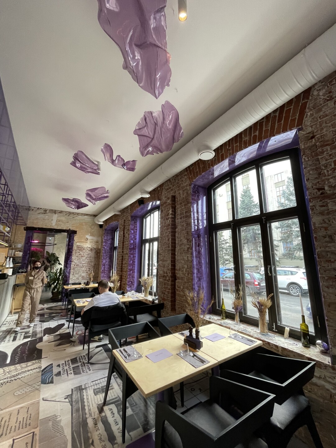 Интерьер на контрастах: монументальную классику (наливной пол, фактурные живые стены и арки, брутальный бар, большие оконные проемы) дизайнер Елена Ткач умело смиксовала с вирусными, цепляющими глаз и прямиком попадающими в инстаграм элементами (цветными полупрозрачными панелями из полимера в модном неоновом оттенке, яркими футуристичными светильниками и огромной репродукцией картины голландского художника Мельхиора де Хондекутера «Птицы в парке»).