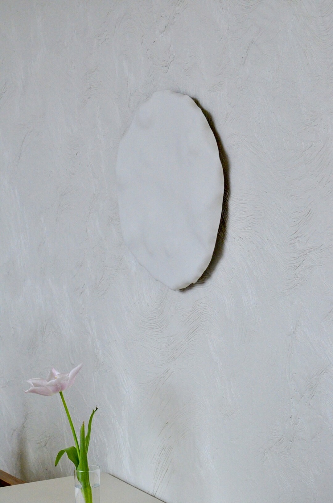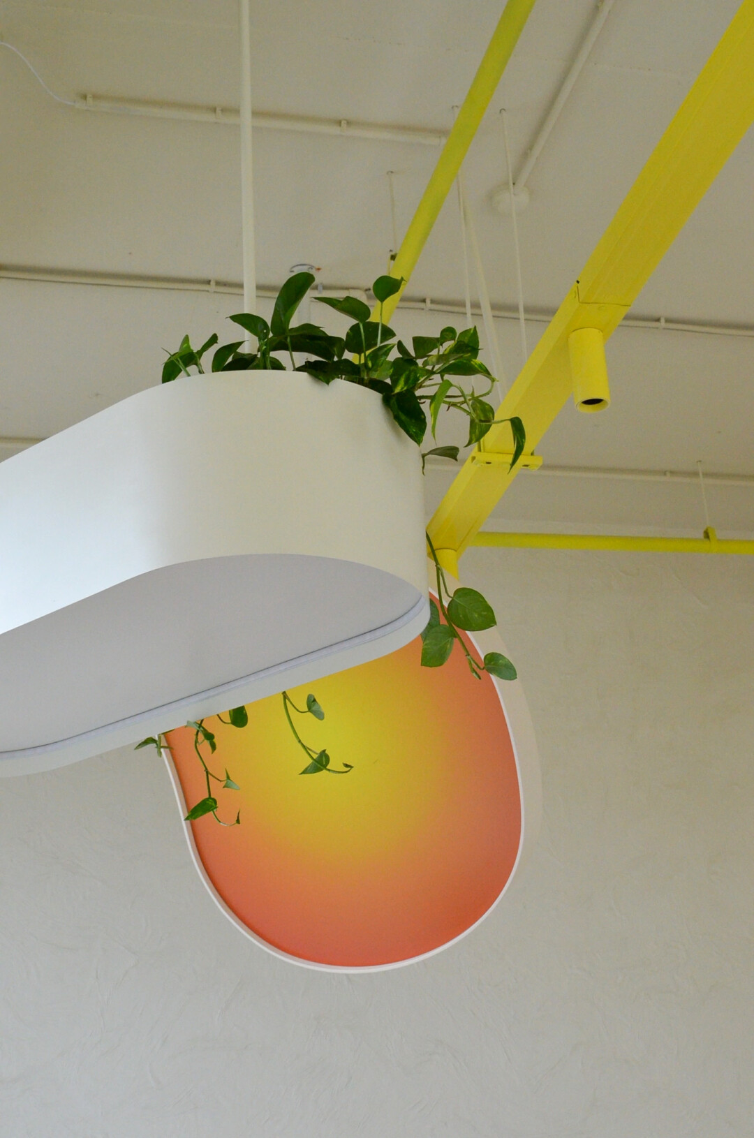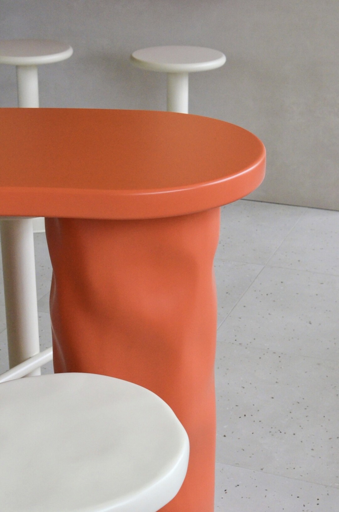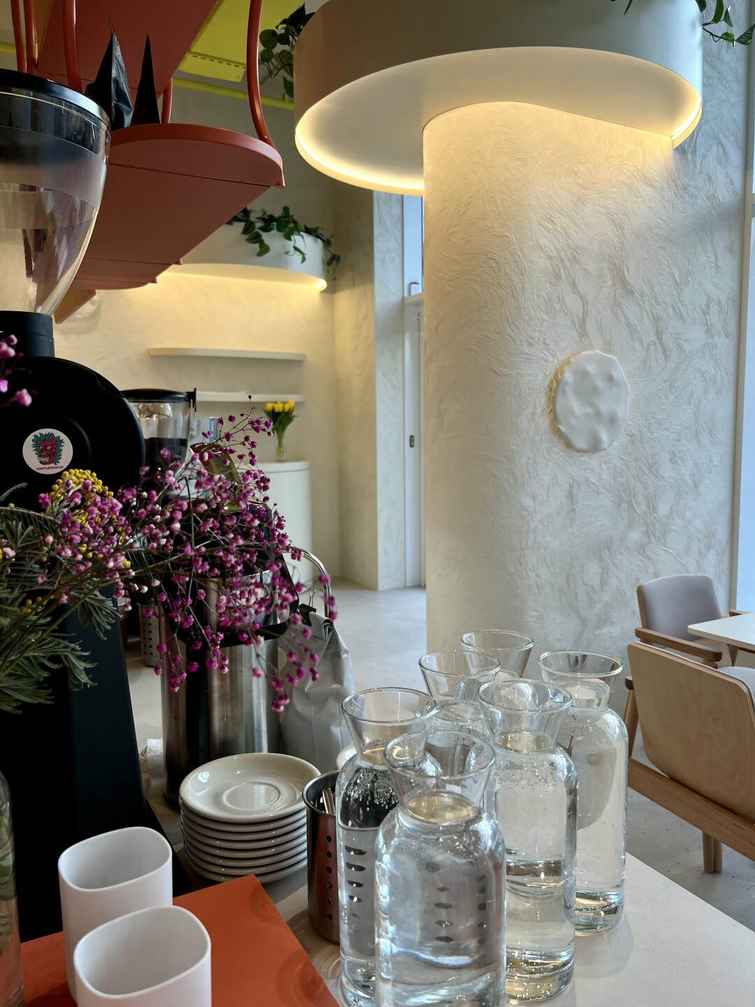 Ответственные за интерьер круассантерии, как всегда, команда Vandall бюро — Вова Анд и Оля Хаматгалиева. Они оставили проект узнаваемым, при этом сделав его не похожим на первые два. В интерьере много воздуха, он стильный, минималистичный и при этом символичный. Узор на стенах повторяет рисунок, появляющийся на поверхности теста при заготовке, с которым так много работает команда. Светильники и стулья с неидеальными поверхностями — тоже отсылка к ручному труду и к особенностям подхода. Тут стремятся создавать наполненный теплом и любовью натуральный продукт. Это не про идеальную симметрию. Конечно, не обошлось и без ярких акцентов в фирменных оттенках: стойки, футуристичные светильники, яркие полки над барной стойкой.