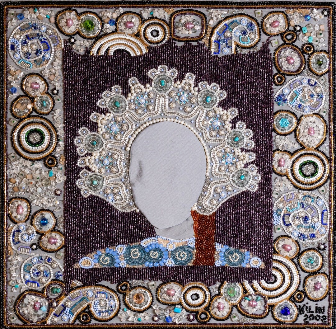 Во многих русских иконах, оказавших влияние на автора, открытыми остаются лицо, кисти и ступни, а все остальное покрыто написанной одеждой, украшенной дорогими камнями и вышивками, с использованием жемчуга.