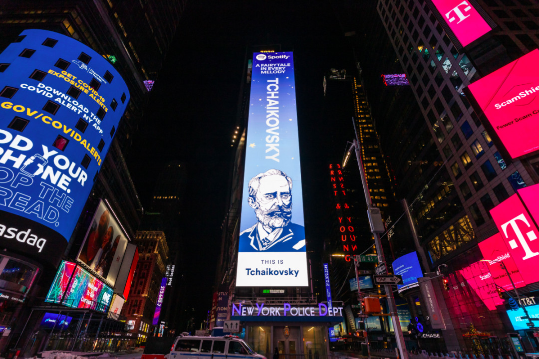 Стриминговый сервис Spotify разместил на знаменитой нью-йоркской площади Таймс-сквер билборд с изображением Петра Ильича Чайковского. На сегодняшний день ежемесячная аудитория русского музыканта составляет 4,8 миллиона пользователей.