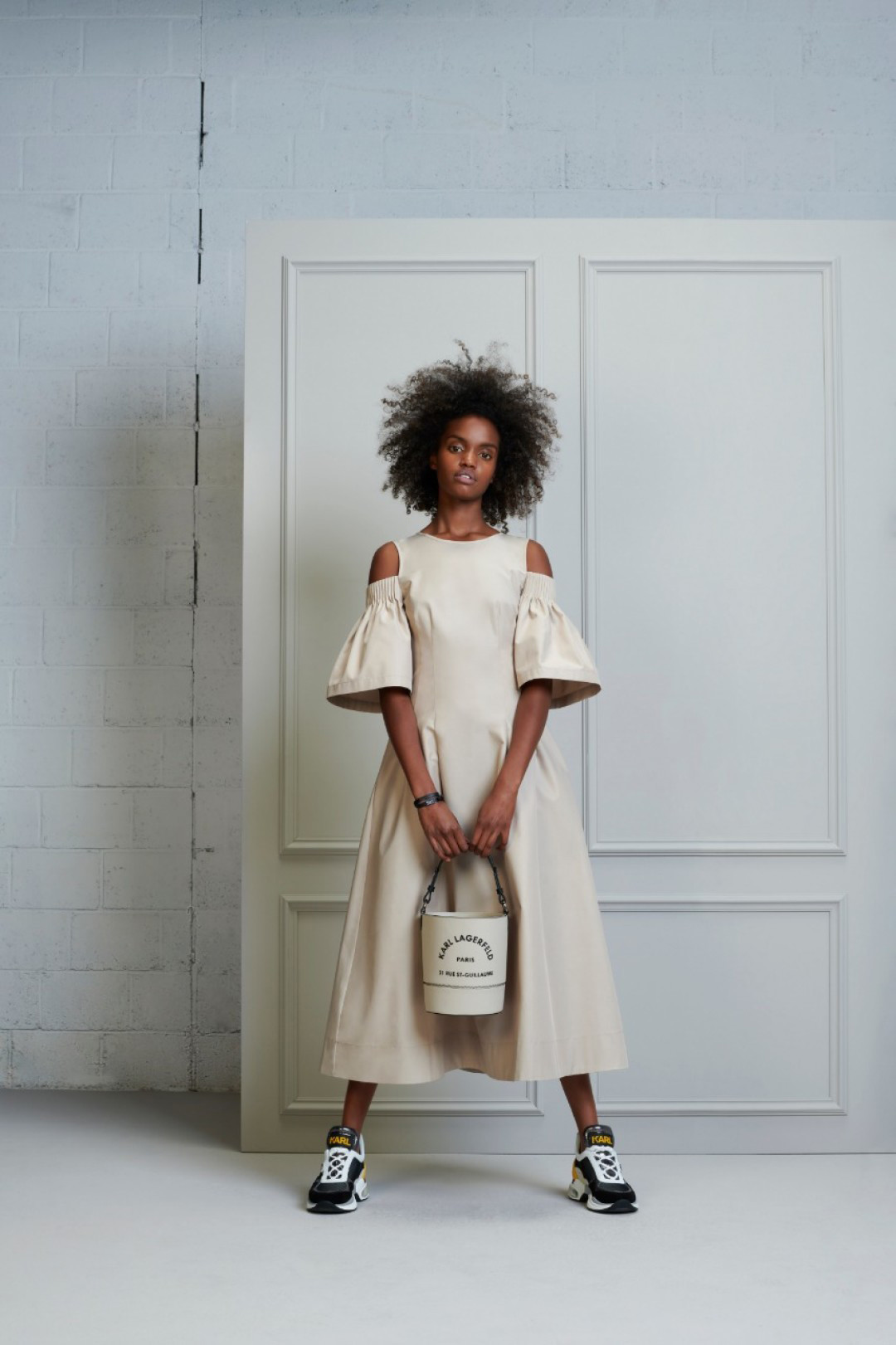 - Сумка-ведро, расклешенное платье с открытыми плечами, кроссовки KARL LAGERFELD от Бутика LUIGIN.