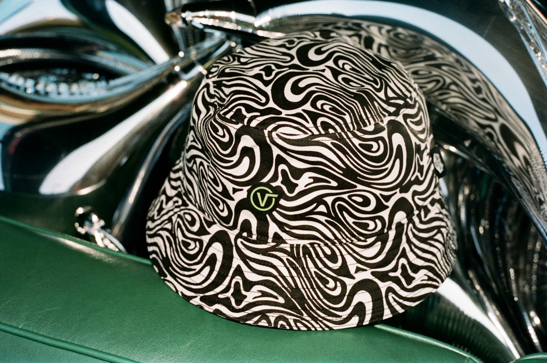 Кеды представлены в двух моделях: Old Skool с психоделическим узором, переливающимся желтым и голубым цветом, а также черно-белые Sid с разноцветными шнурками, контрастной строчкой и полупрозрачной зеленой подошвой.