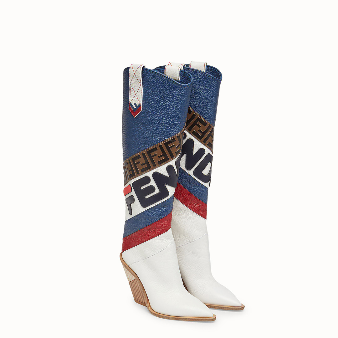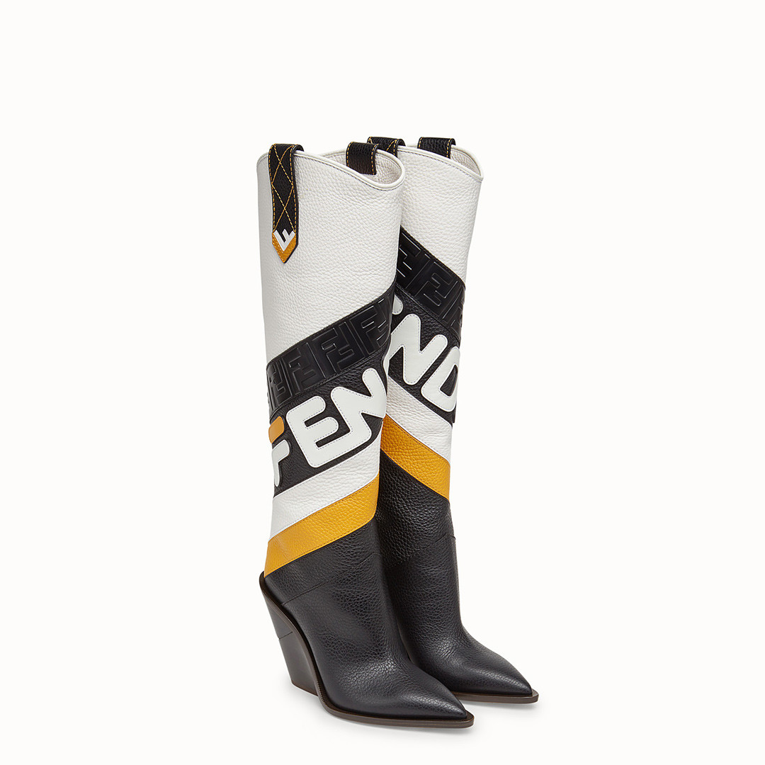 Вещи с принтом, усыпанные логотипами брендов, были долго «под запретом» у тех, кто разбирается в моде. Сегодня тренд из 1990-х завоевал мир. Казаками сезона смело можно назвать сапоги Fendi. После публикации мема про мэшап Fendi и Fila инстаграм-художник @hey_reilly, сам того не зная, привлек внимание креативного директора Сильвии Фенди, а результат смотрите сами. Дизайнеры бренда порадовали модниц цветами, каблуком с геометрическим вырезом и даже высотой! Такой набор характеристик для одной модели обуви — прямое попадание в сердце.