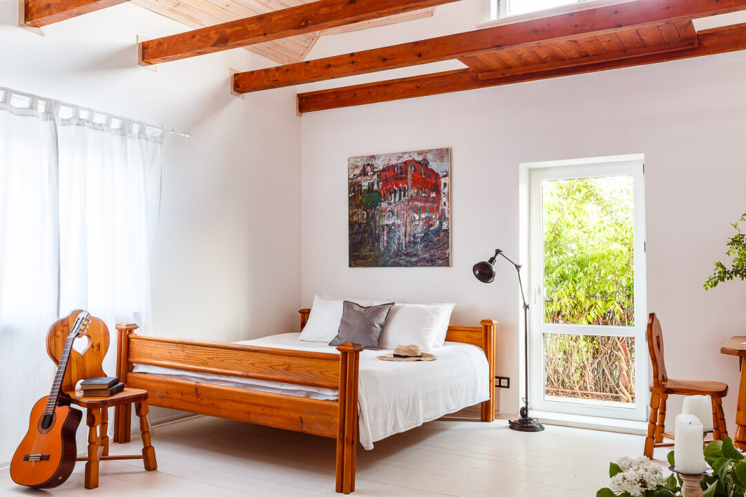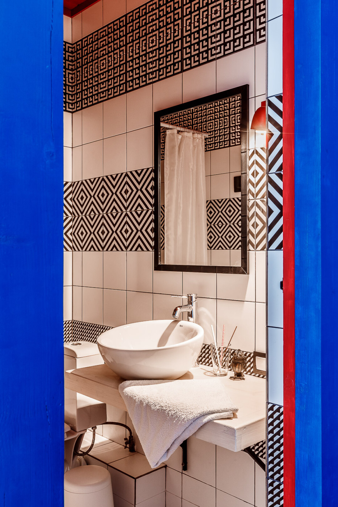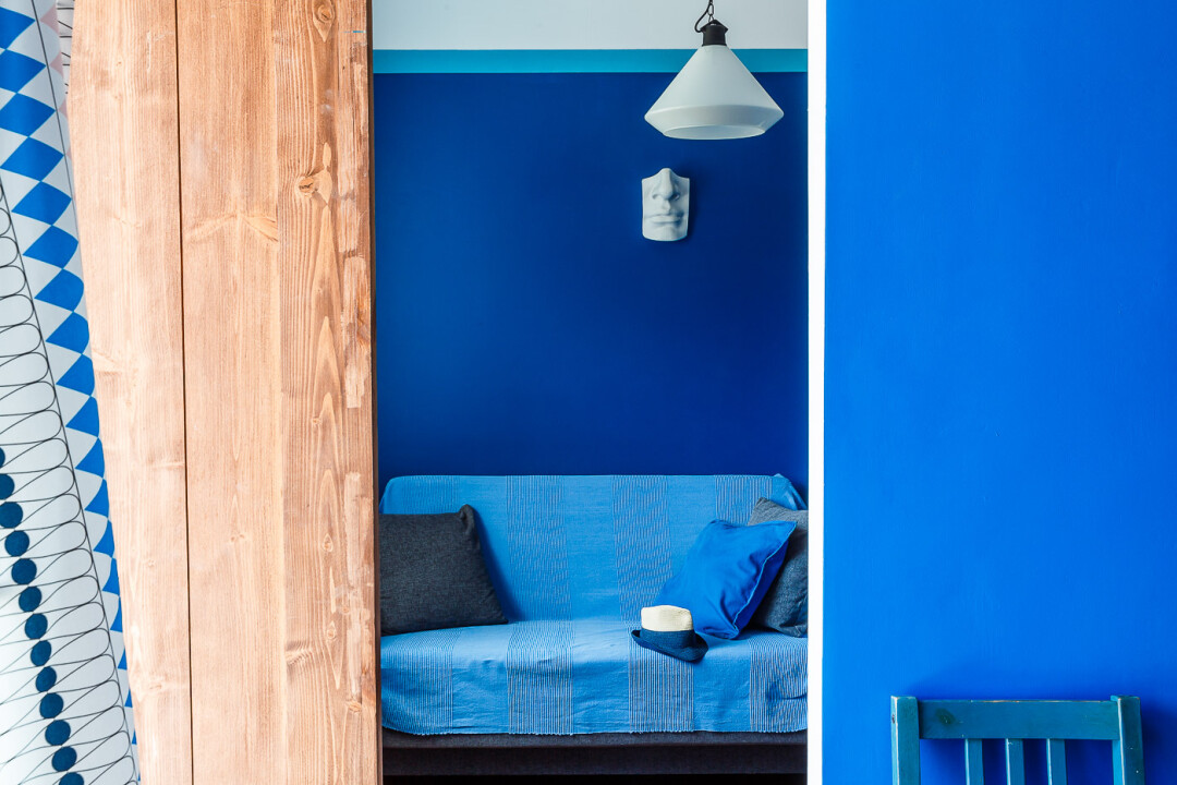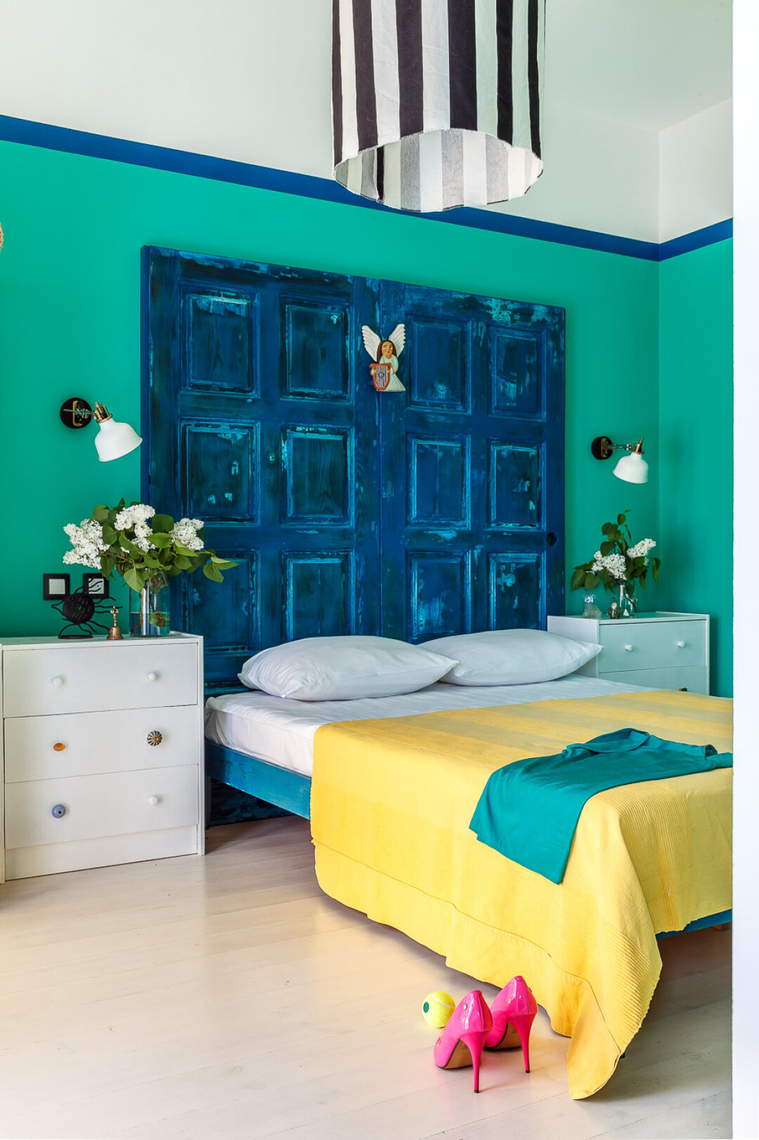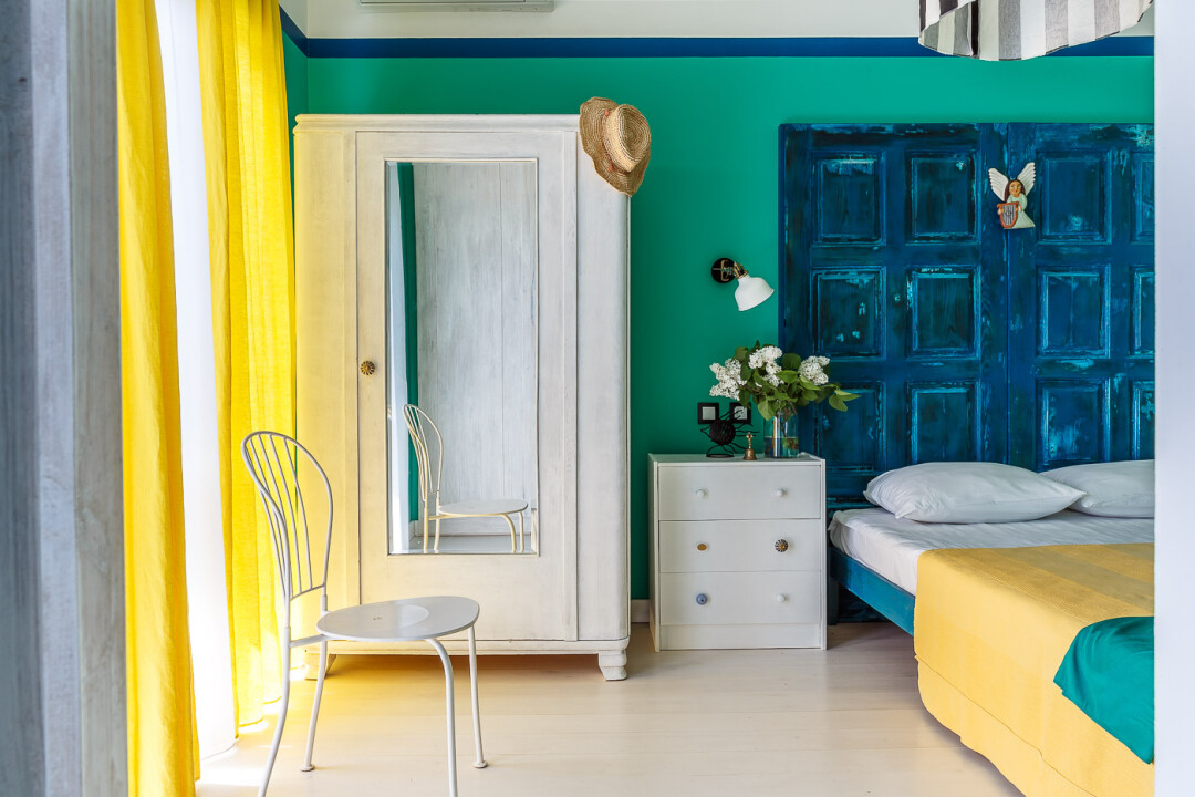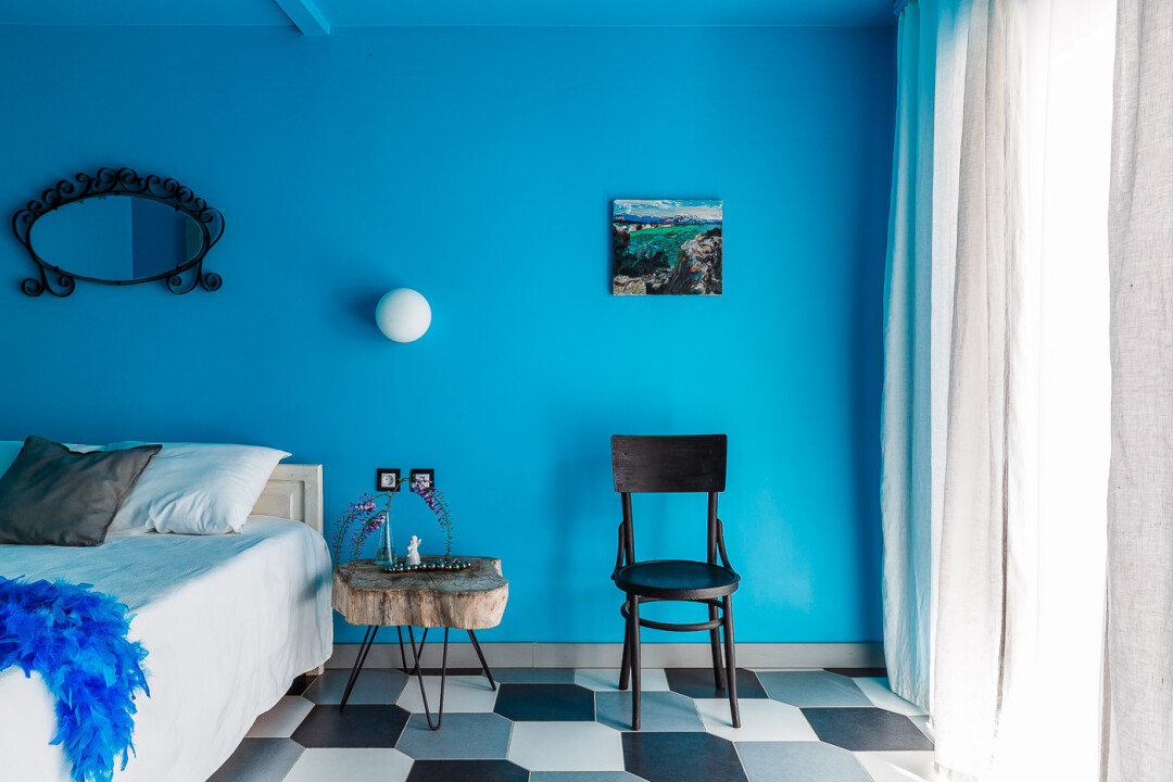 Декоратору, нынешней владелице проекта, и ее сестре сам дом был передан по наследству, изначально его построила мама Ольги. Он строился под небольшую гостиницу двадцать лет назад. Ольга Иевлева пыталась продать его, но ее всегда что-то останавливало, поэтому было принято решение выкупить свою часть и подарить дому новую жизнь. В 2016 году началась масштабная перестройка — из девяти номеров команда решила оставить только пять (зато каких!). Все отделочные работы, дизайн и декор тут делали самостоятельно. Планировку Ольга сделала одинаковой в каждой комнате, а «начинку», наоборот, разной. Тут винтажные находки, классика «ИКЕА» и предметы из личной коллекции хозяйки, живопись современных художников в каждом номере: Дмитрия Кедрина, Олега Елового, Ивана Макарова и краснодарской художницы Натальи Четвериковой. И нетривиальные, но такие фотогеничные решения, например, в изголовье кроватей «Зеленого» и «Синего» номеров поместили выкрашенные в разные цвета деревянные двери, роль прикроватных тумб играют чемоданы, а в качестве журнального столика отлично смотрится деревянный ящик. Все номера получились яркими, уютными и самобытными.