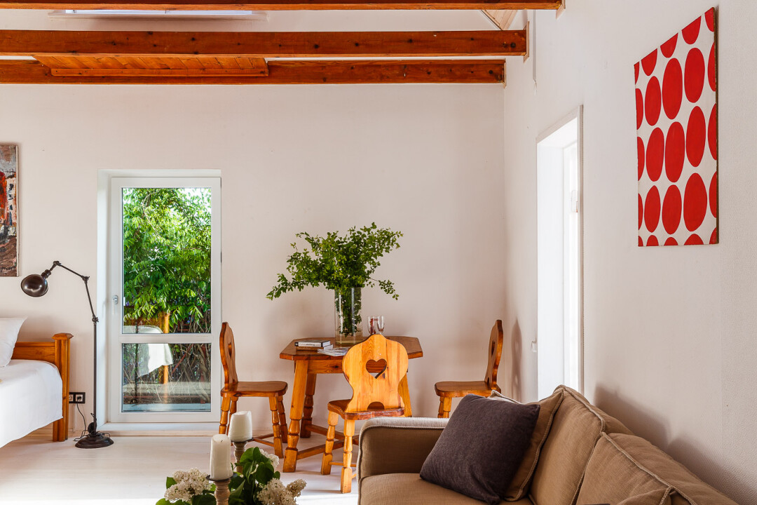 «Белый» идеально подойдет для семьи или тех, кому важен простор. Светлое двухэтажное пространство (75 кв. м) оснащено отдельным входом — можно подняться на второй этаж с улицы по винтовой лестнице. На первом этаже номера расположены гостиная, спальня и санузел. На мансардный этаж ведет отдельная лестница внутри дома, там устроена детская спальная комната с двумя односпальными кроватями. А еще в нем есть большой отдельный балкон, увитый глицинией. «Розовый», «Бирюзовый» и «Синий» с «Зеленым» похожи: первые два — двухкомнатные, рассчитаны на четырех посетителей, вторые два тоже. Все они также имеют зоны отдыха под открытым небом, первые два выходят на широкую удобную террасу, а вторые выход на балкон.