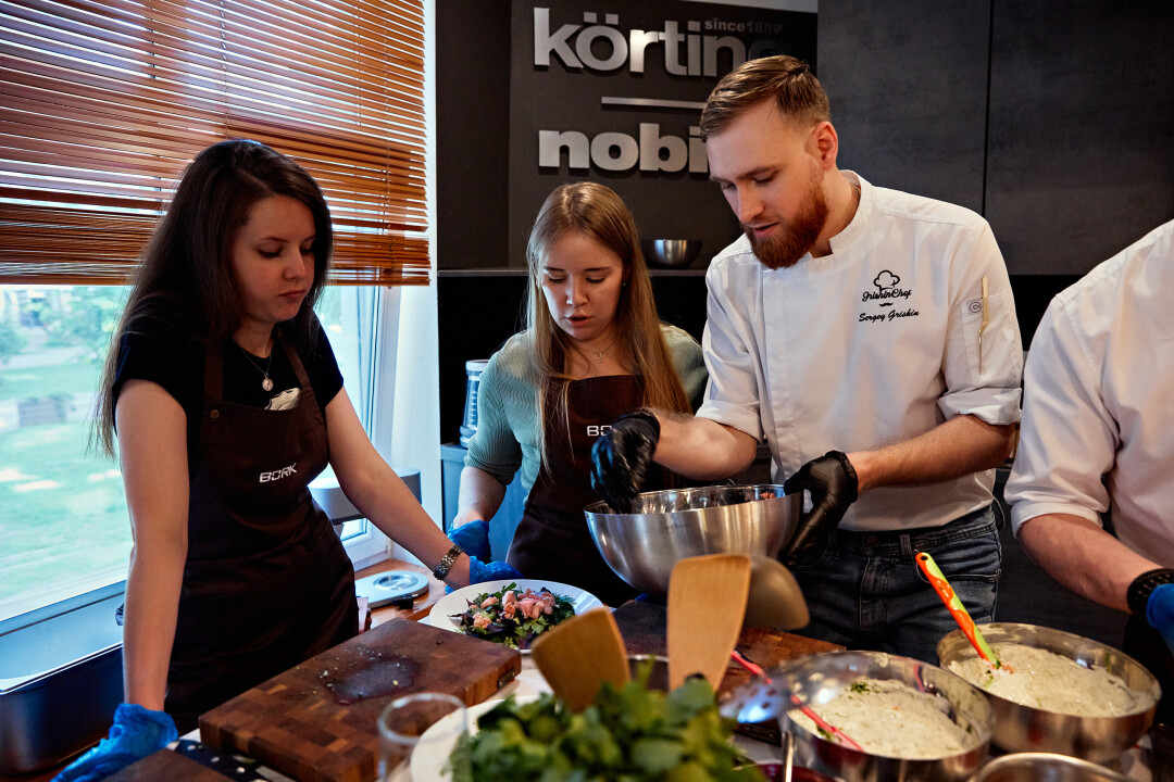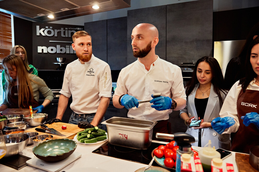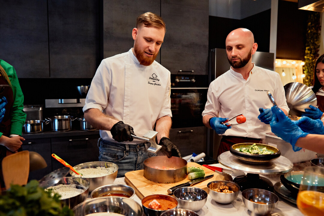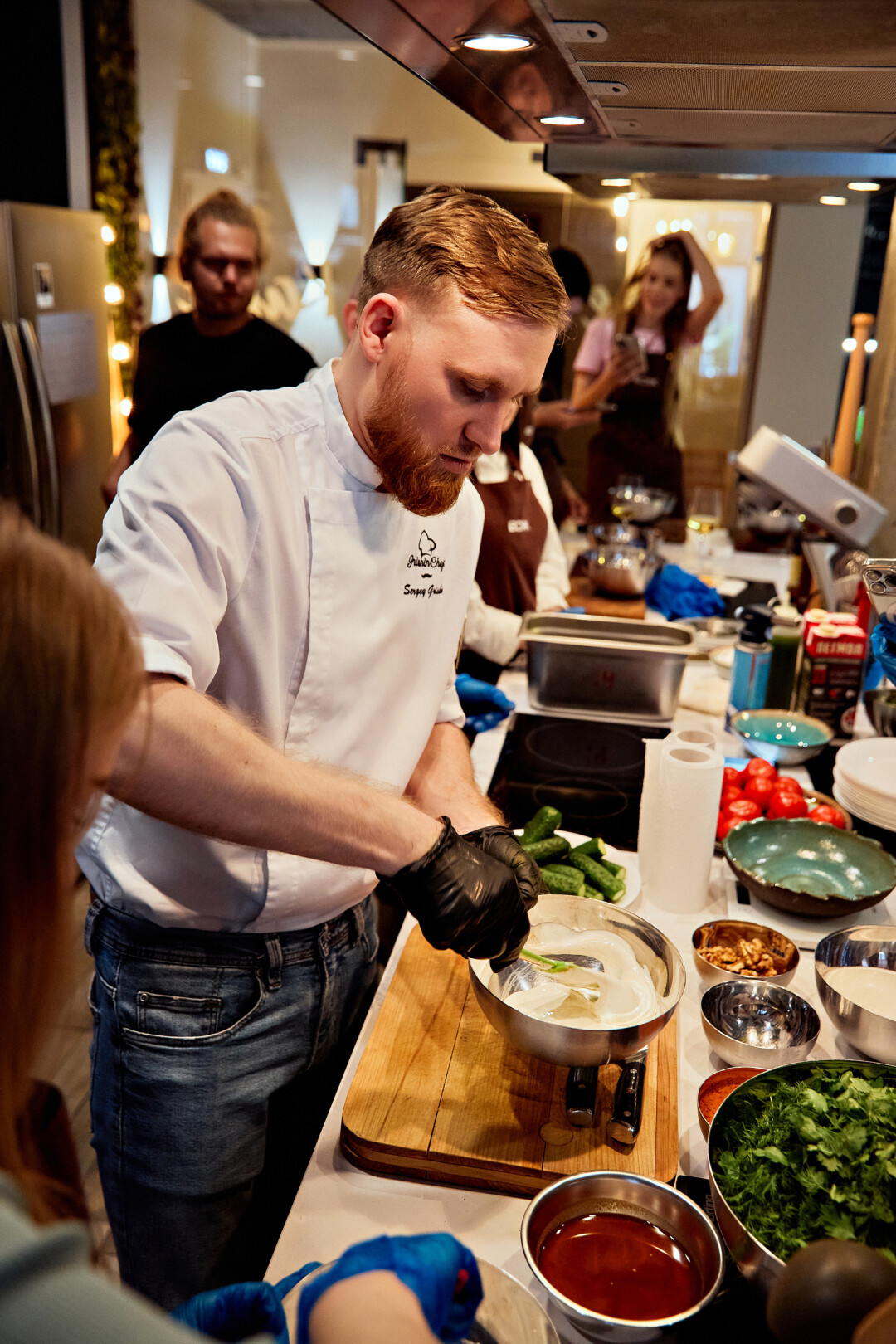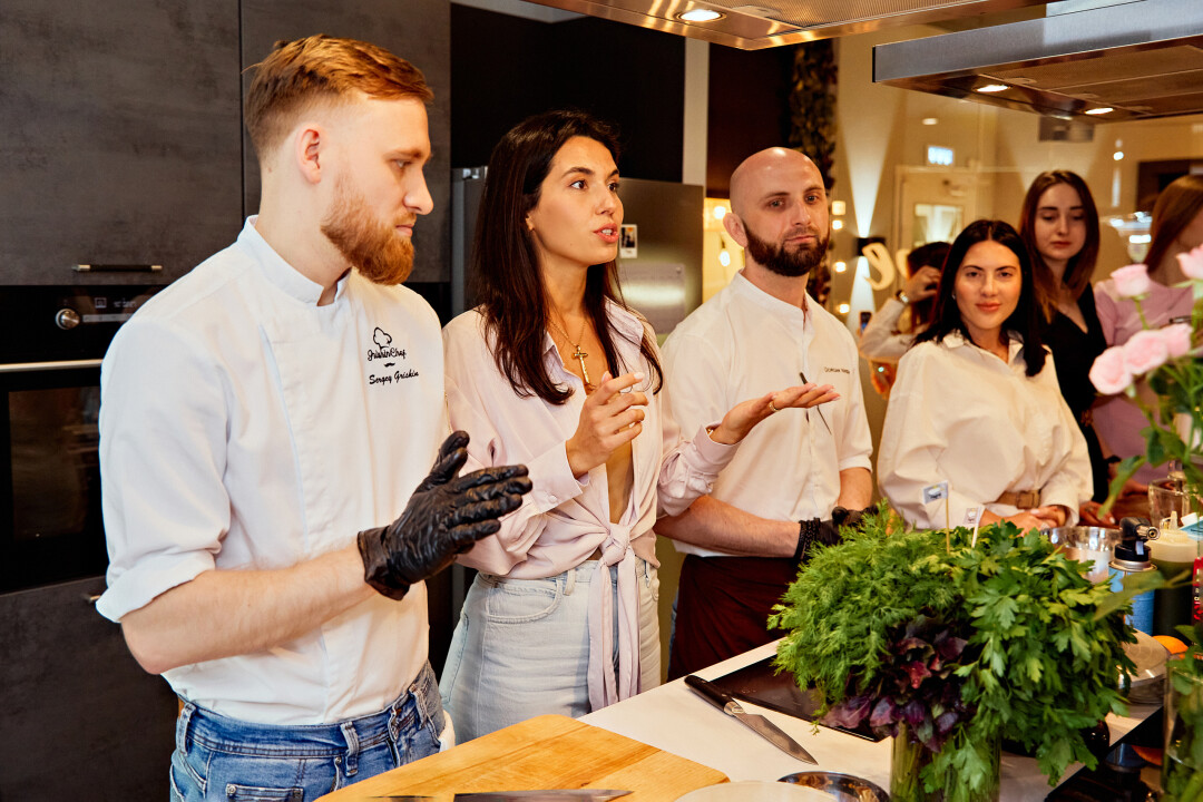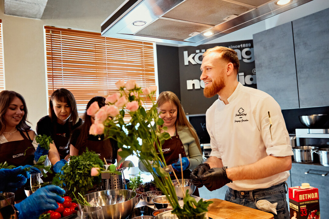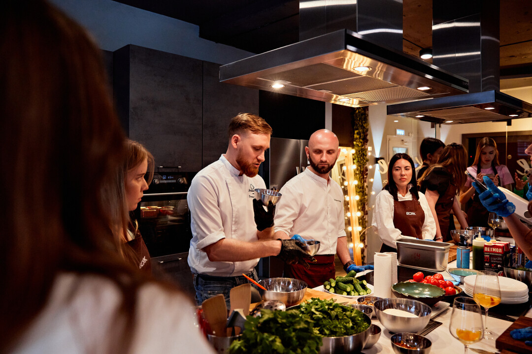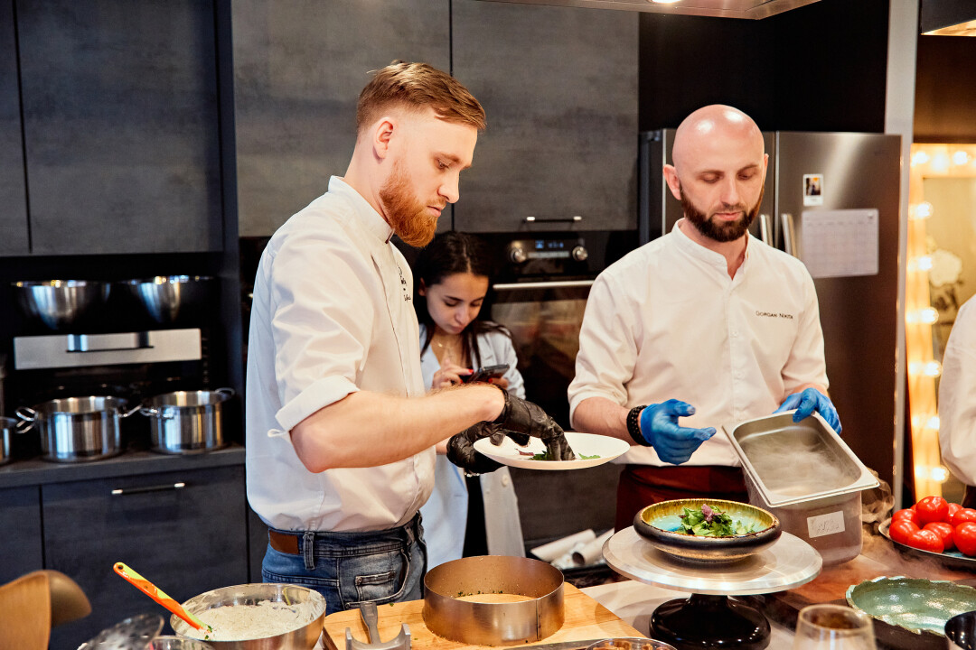 Еще один кулинарный мастер-класс проекта #ктонакухнехозяин от журнала «Сочи — Краснодар. Собака.ru» прошел в студии «Каре». Руководили процессом два шеф-повара Boroda Group — Никита Горган и Сергей Гришин. В окружении прекрасных девушек-участниц они приготовили три блюда из обновленного меню ресторана «Бородашвили Младший» и удивили всех присутствующих подачей. Самые активные гости получили подарки от партнера проекта — компании «Ключевское».