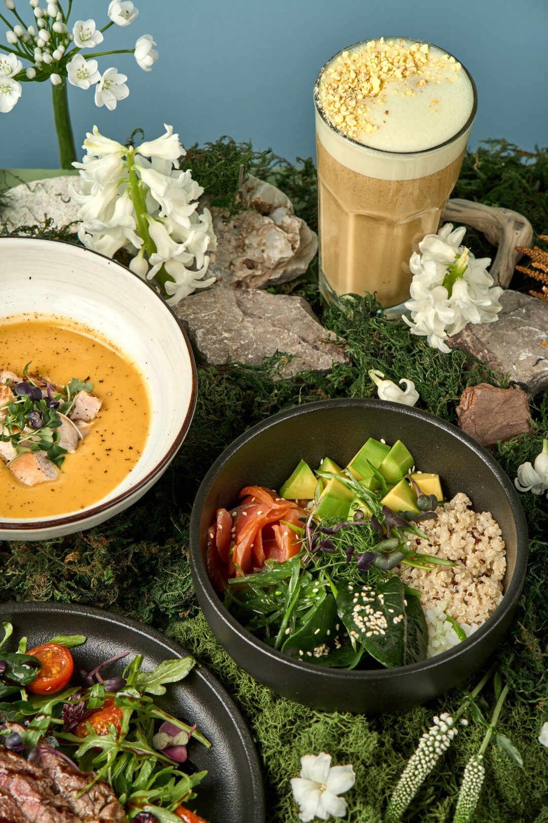 Чтобы продолжить — пшенная каша с камчатским крабом или сырные вафли с неркой и авокадо для тех, кто ценит палитру вкуса и текстуру. Хит меню — шпинатный омлет с креветками. Попробуйте, и он станет вашим новым фаворитом.