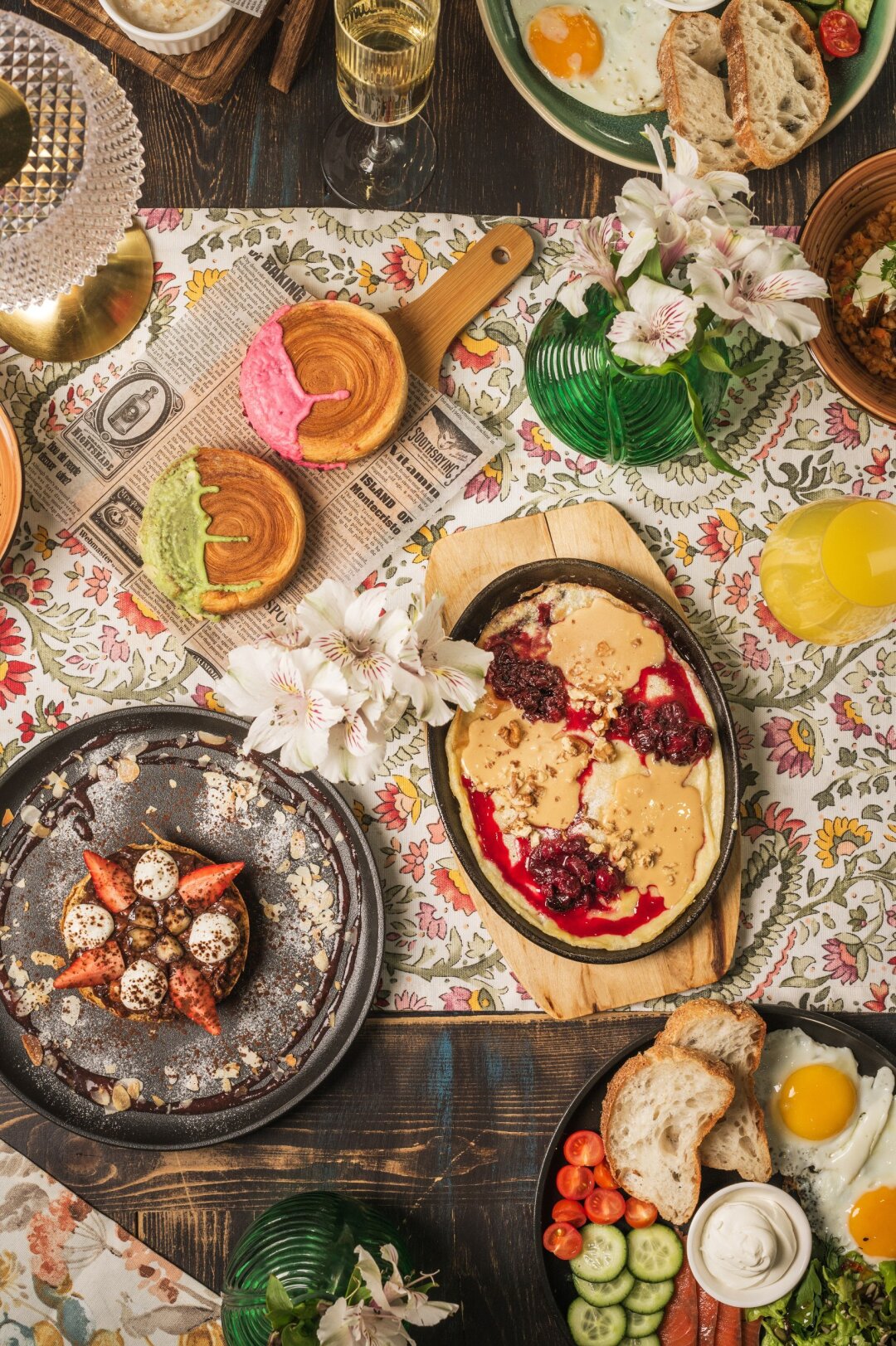 Выбор редакции — финский блин с вишней, арахисовой пастой и грецким орехом. Подается на горячей сковороде. На родине в Финляндии его называют «торт на сковороде».