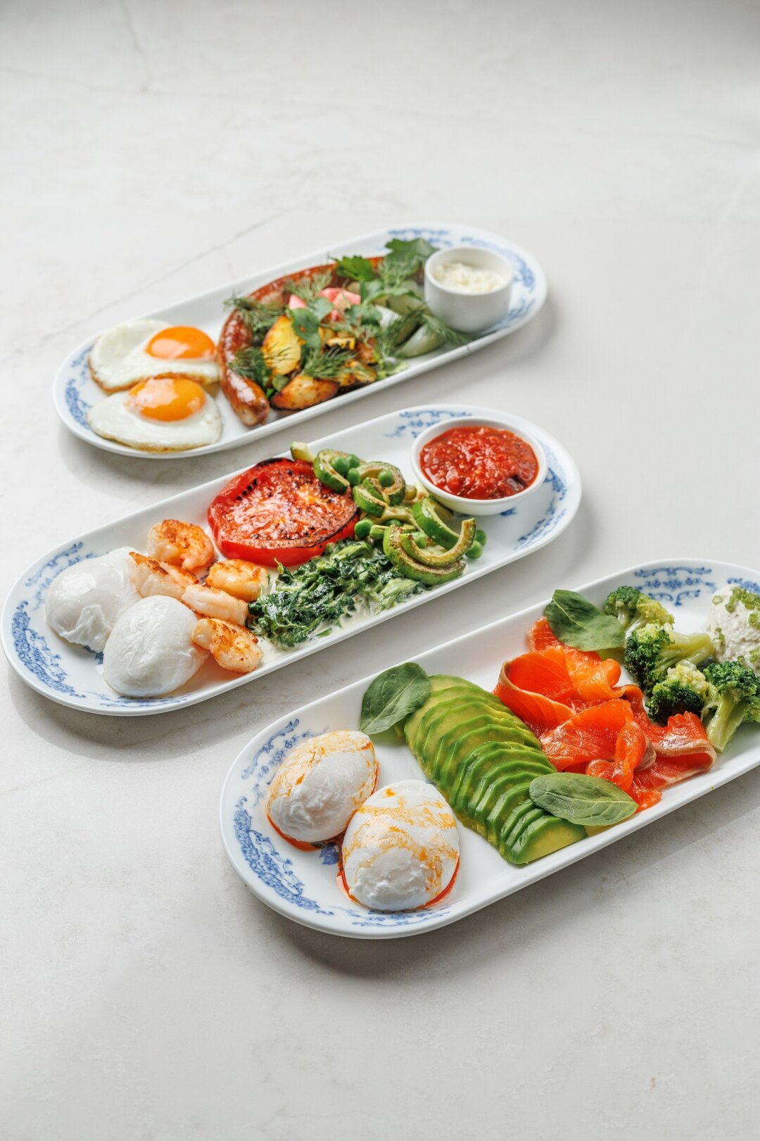 Выбор редакции — большой завтрак с рыбой. Чтобы зарядиться на весь день, попробуйте оладушки из цукини со слабосоленой форелью, скремблом, зеленым салатом, кремовым хумусом и снежным крабом со сметаной.