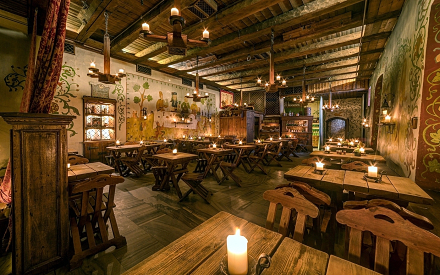 За кухню такого качества отвечает шеф Эммануэль Вилле — повар раньше готовил для королевской семьи Бельгии и в ресторане с двумя мишленовскими звездами. На разработку блюда у него уходит до полугода — чтобы сохранить аутентичные рецептуру, технологию и ингредиенты, но найти баланс между средневековой традицией, например, предписывающей богатому столу изобилие специй, и вкусовой гармонией, предполагающей умеренность в их использовании. Напитков конкретно это самоограничение не коснулось: специи, согласно средневековой манере ими спасать портящийся алкоголь, можно сказать, второе имя местной алкогольной карты. Пиво — медовое, с корицей или настоянное на травах, домашние вина, кларет и ягодные ликеры — все это пряное, хмельное и сладкое, но эффект погружения в глубину времен укомплектовывает полностью — в свечном чаду под медитативные звуки блок-флейты вполне могут начать мерещиться Старки и Ланнистеры.