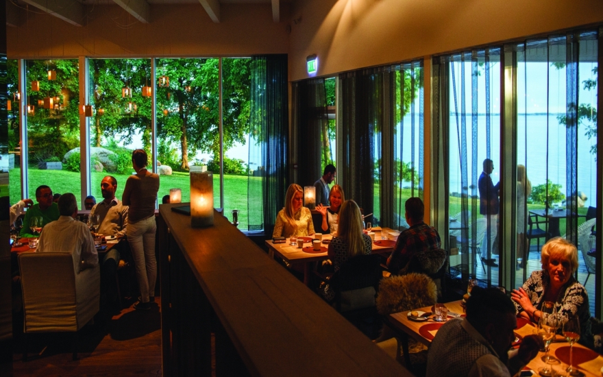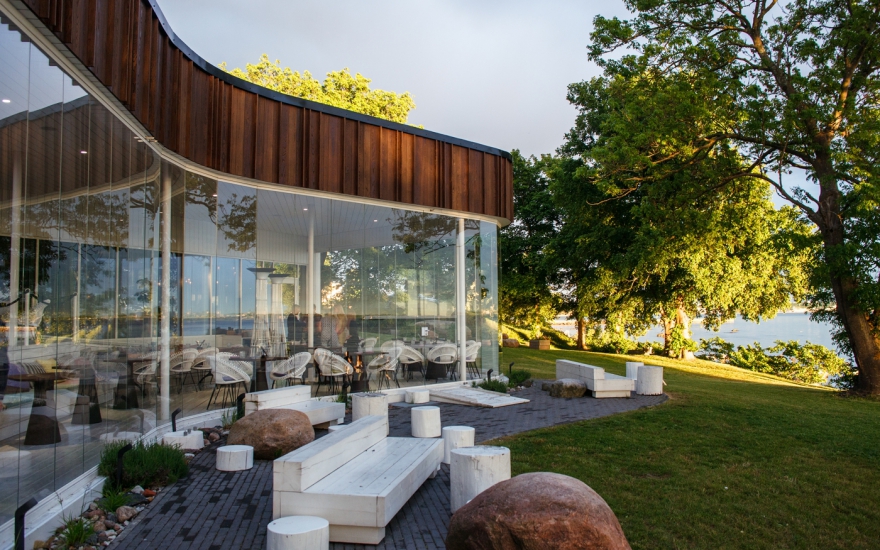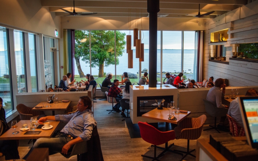 Меню изменяется постоянно — июньскую черемшу и ревень в ингредиентах затем сменят миноги, лесные ягоды и тыква. В самом ресторане регламент проще, но атмосфера все равно возвышенная: современная постройка на самом берегу со стенами из стекла, чьи контуры повторяют линию прибоя, главным декоративным элементом днем имеет золотистый под солнцем шелк Таллинского залива, вечером — эпической красоты закаты. Кухня тоже, можно сказать, в основе имеет дуэт природы и современных технологий: маслянистую сладость слайсов мраморной говядины аранжируют на хрустящем чипсе из куриной кожи, национальные кулинарные жанры рыбы в сметане и выпечки с мясом стали малосольной сельдью под воздушной шапкой сметанного крема с яблоком и практически сладким, как ватрушка, пирожком с лосятиной и брусничным соусом, взбодренным чили.