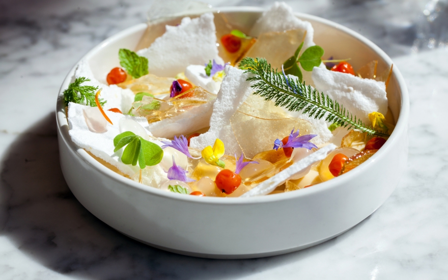 К тартару из лося идут маринованный мох, копченый желток, икра форели, хрен и укроп в разных агрегатных состояниях от крема до пыли. Описание одного соуса к перепелке с фермы Ярвеотса, которая провела не один час в маринаде и сувиде, занимает у официанта несколько минут — в общих чертах это масляный соус на морковном соке с эмульсией эстрагона. За разнообразными пенами и пеплами при этом идеи блюд не теряются — скажем, травянистому вкусу монументальной на вид цветной капусты удачно противопоставлена карамельная сладость, в можжевеловом десерте важно сочетание текстур: желеобразные капли геля из джина с тоником и ломкое безе.