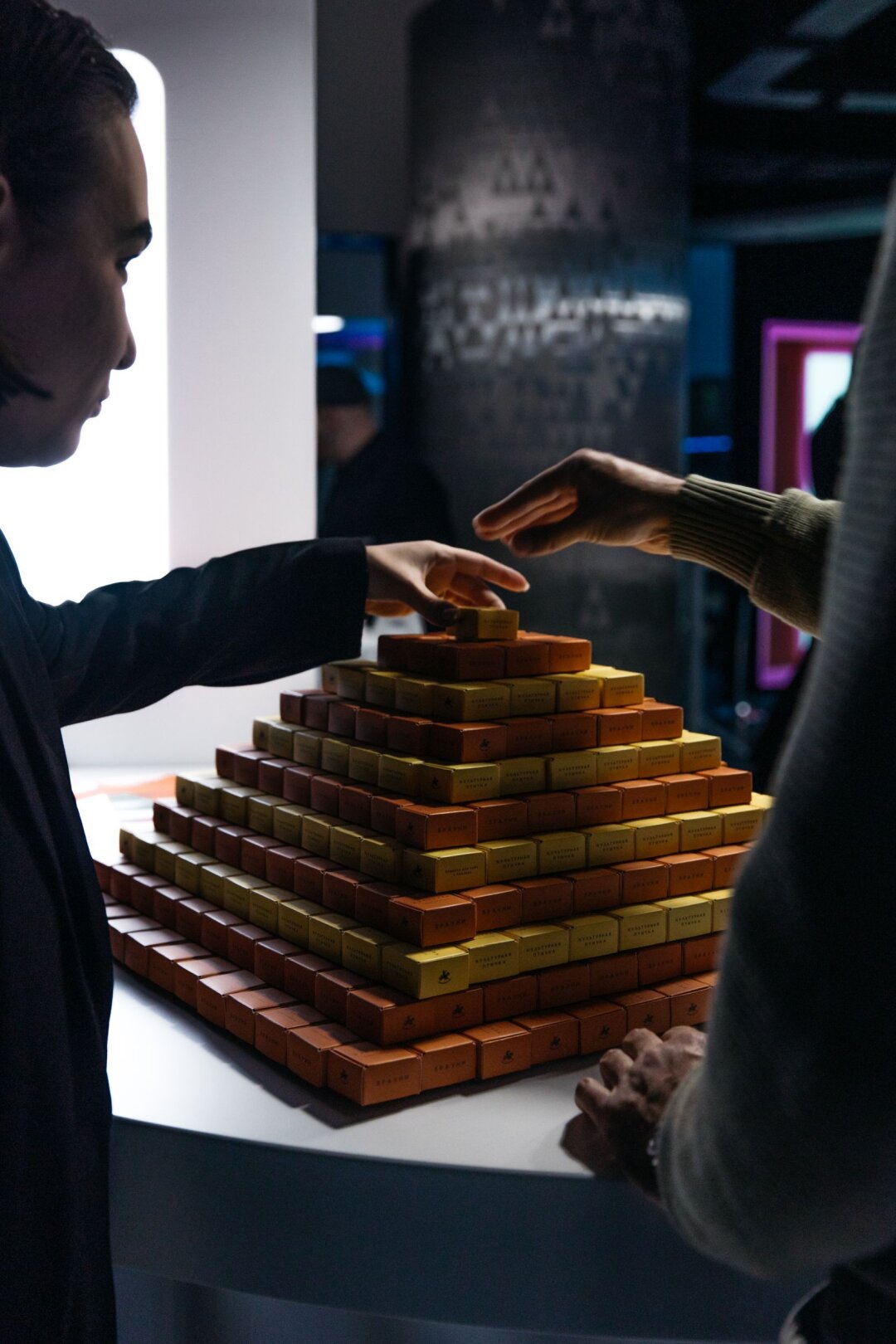 Визуальной доминантой вечера стала первая обложка выпуска арт-дропа. По ее мотивам гостям показали инсталляцию «Абсолют» от студии инновационного медиа дизайна и главных по цифровому искусству в Петербурге ILLUMINARIUM3000 в коллаборации с мультидисциплинарной художницей Кристиной Сидоровой и на музыку Ильи Сидорова.