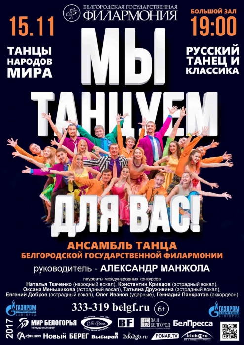 Под руководством главного балетмейстера Александра Манжолы ансамбль танца представит новую программу «Мы танцуем для Вас!». Она включает в себя «Калинку», «Казачий пляс», русскую кадриль, балетный жанр, латиноамериканские танцы и многое другое.