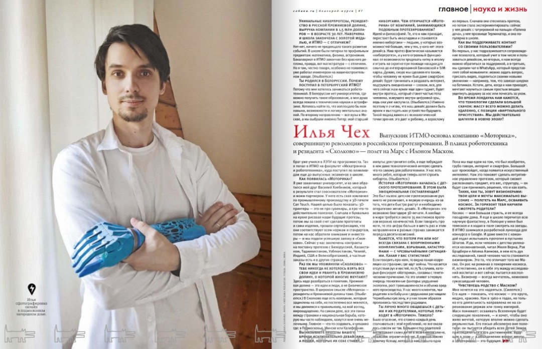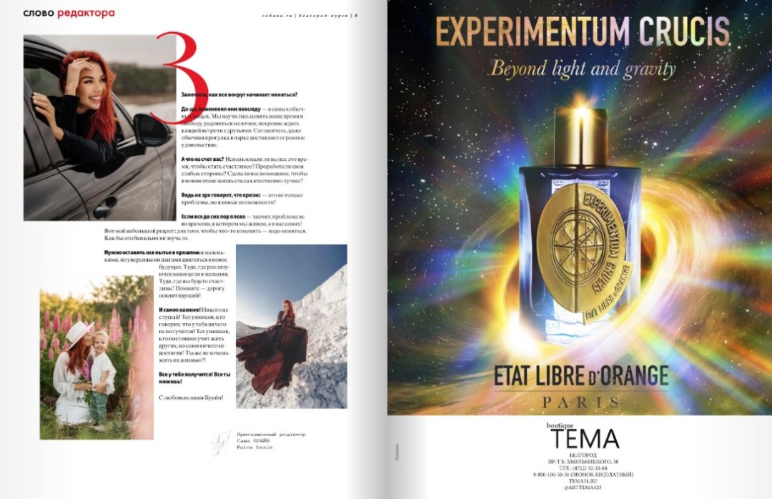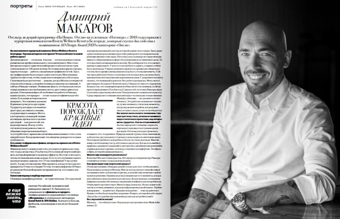 Далее рубрика журнала — «Портреты». В этот раз общаемся о духовном и материальном с Дмитрием Макаровым — отельером, ведущим программы «На Ножах. Отели» на телеканале «Пятница» и управляющим курортным комплексом Riviera Wellness Resort в Белгороде. Курск, в свою очередь, познакомил нас с Надеждой Петраш — пластическим хирургом, косметологом и основателем курской клиники эстетической медицины «НикаМед».