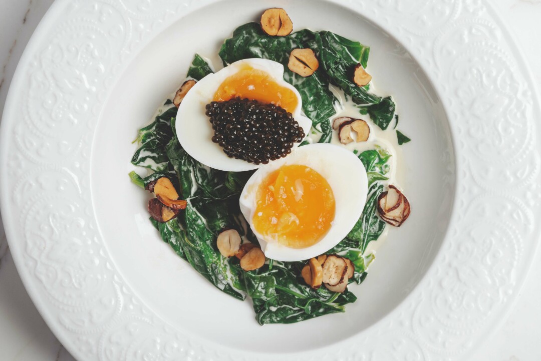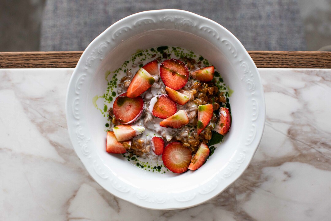 В ресторане под крышей Центрального рынка не одно, а сразу два меню завтраков. Большое — которое подают с 8 до 12, и сокращенное, действующее еще два часа. Бесчисленные пашоты и бенедикты, сладкие и соленые каши подают только с утра, зато мандариновую запеканку, оладьи с хурмой, блины с икрой и главный хит — творожное кольцо с маком — вплоть до обеда.