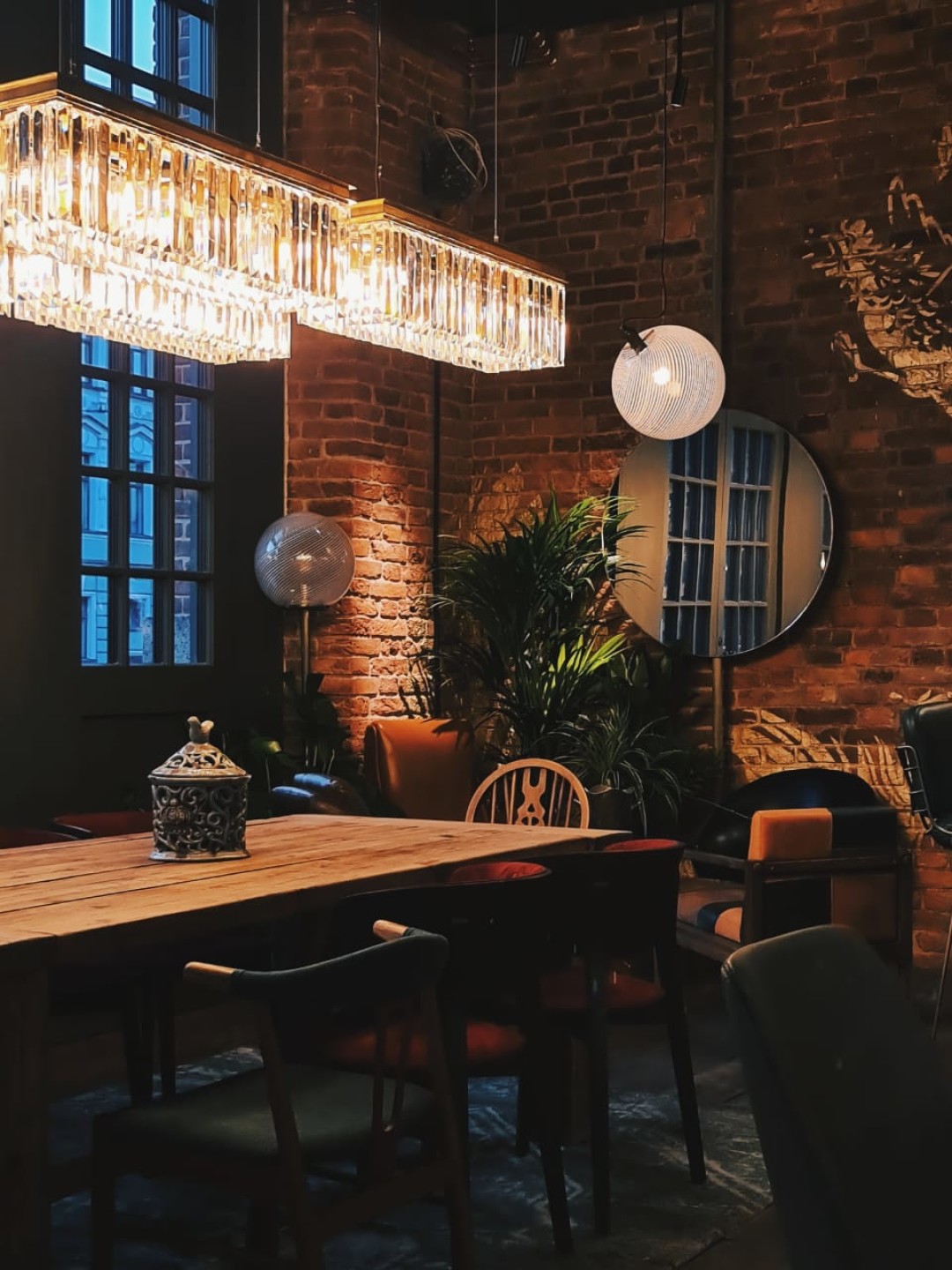 Дизайн Cococo bistro делала команда DA Architects — внутри восстановленный исторический кирпич, винтаж на стиле, люстры с претензией, восьмиметровые окна в пол, выстланный старинной доской. Умение команды — делать проект так, будто он был здесь всегда, и этого места точно не хватало Новой Голландии. Пока работает только терраса под раскидистыми кленами, и когда выходит солнце, лучи достают через кроны деревьев и гуляют по маленьким столикам.