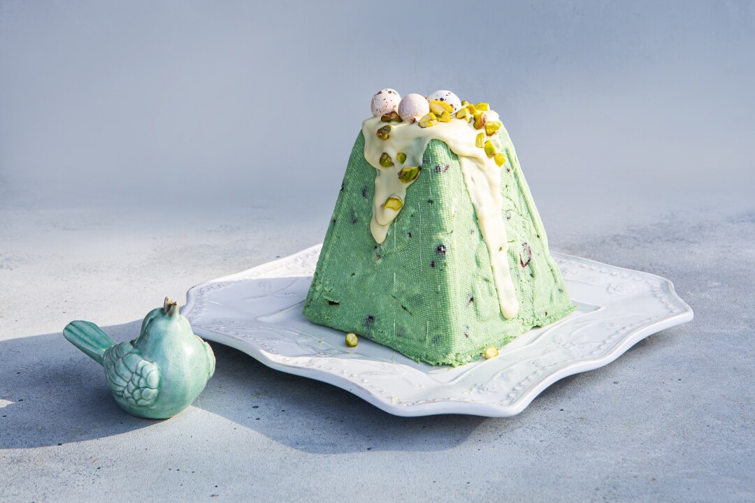 3. Вскипятите сливки, разведите в них шоколад и фисташковую пасту. Взбейте смесь погружным блендером, остудите.